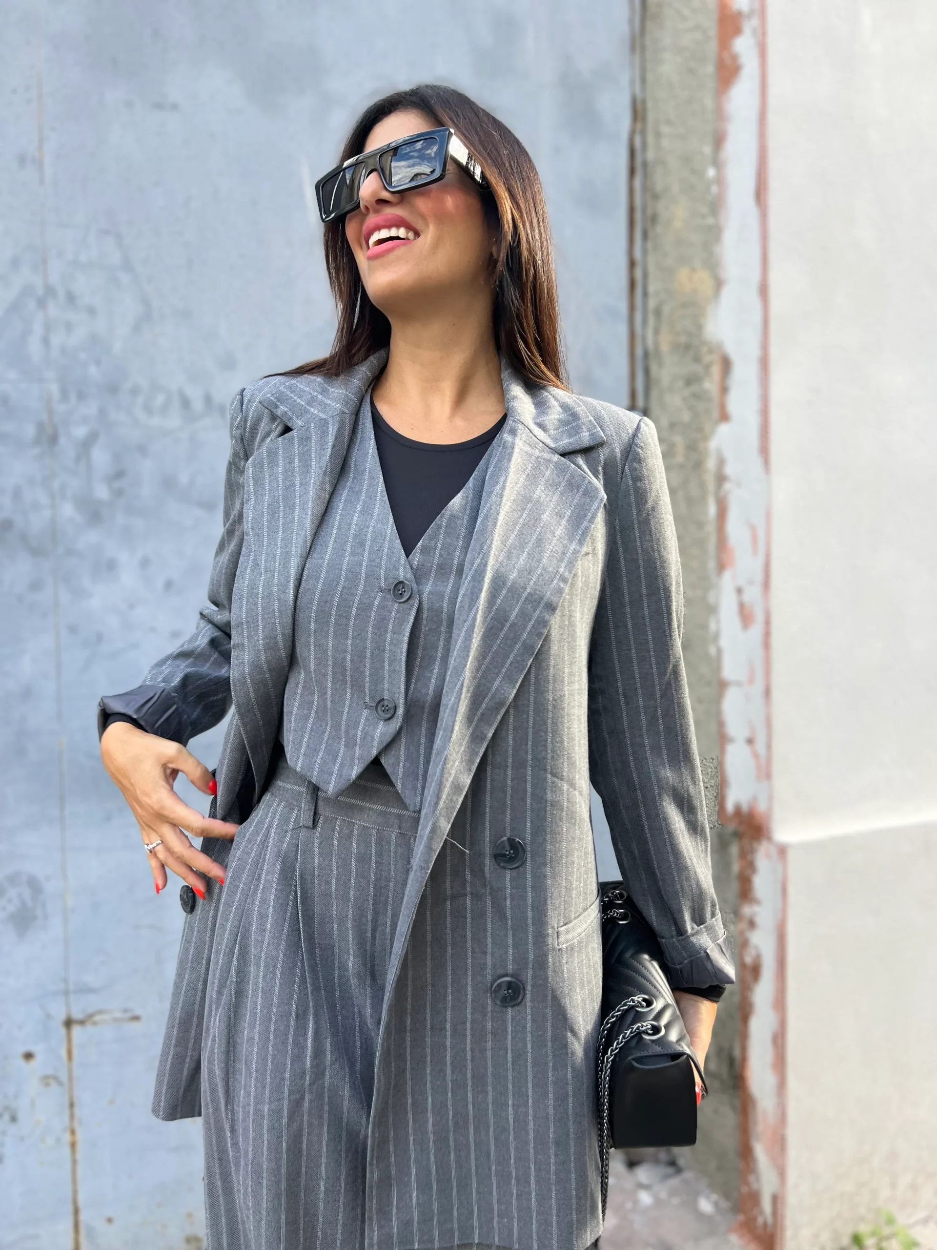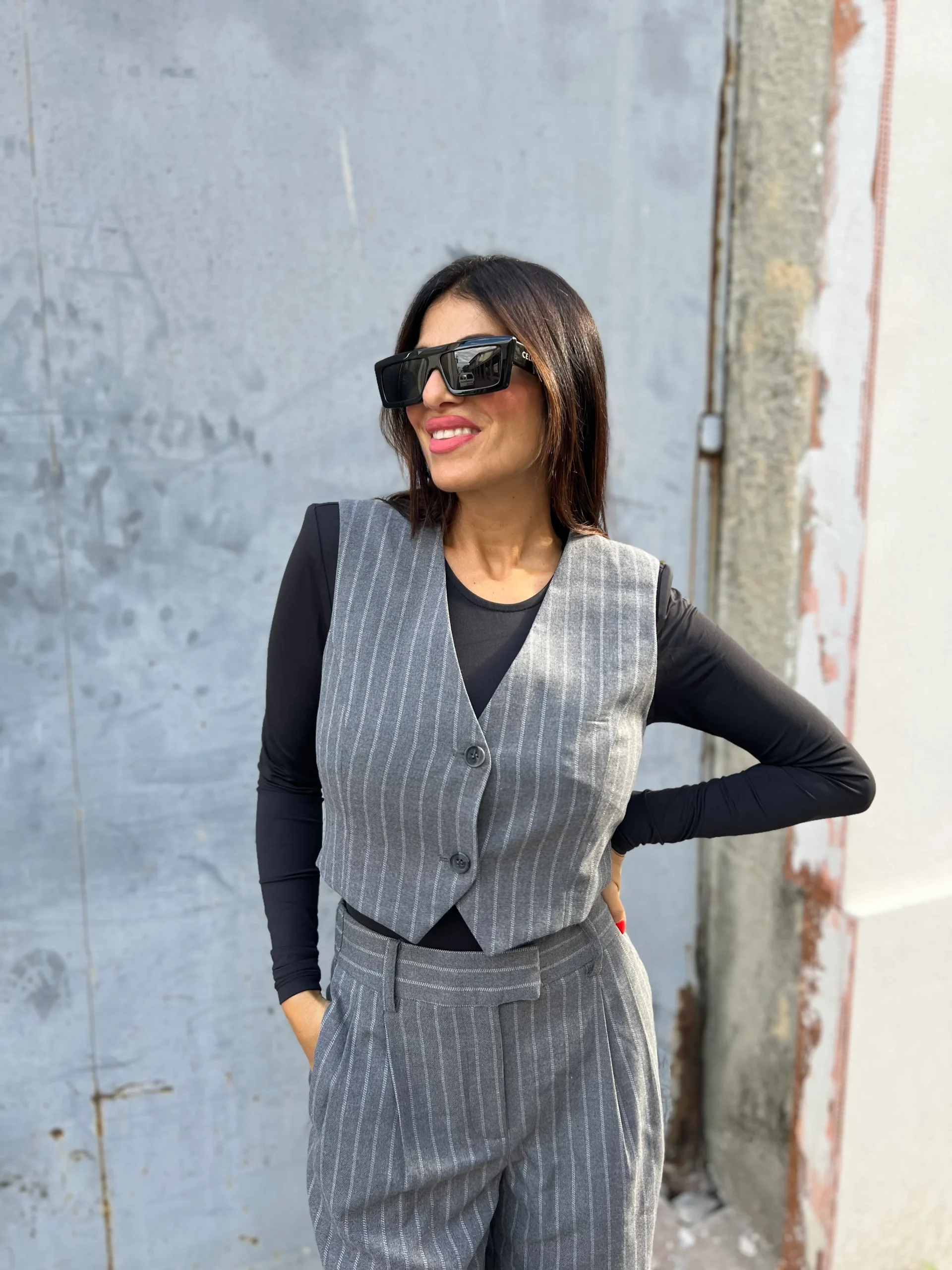 Gilet monopetto gessato grigio, chiusura con bottone, 80% poliestere
