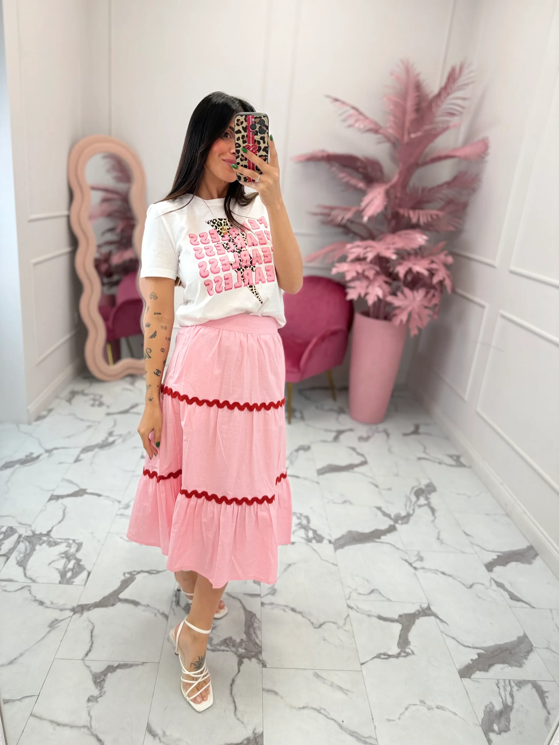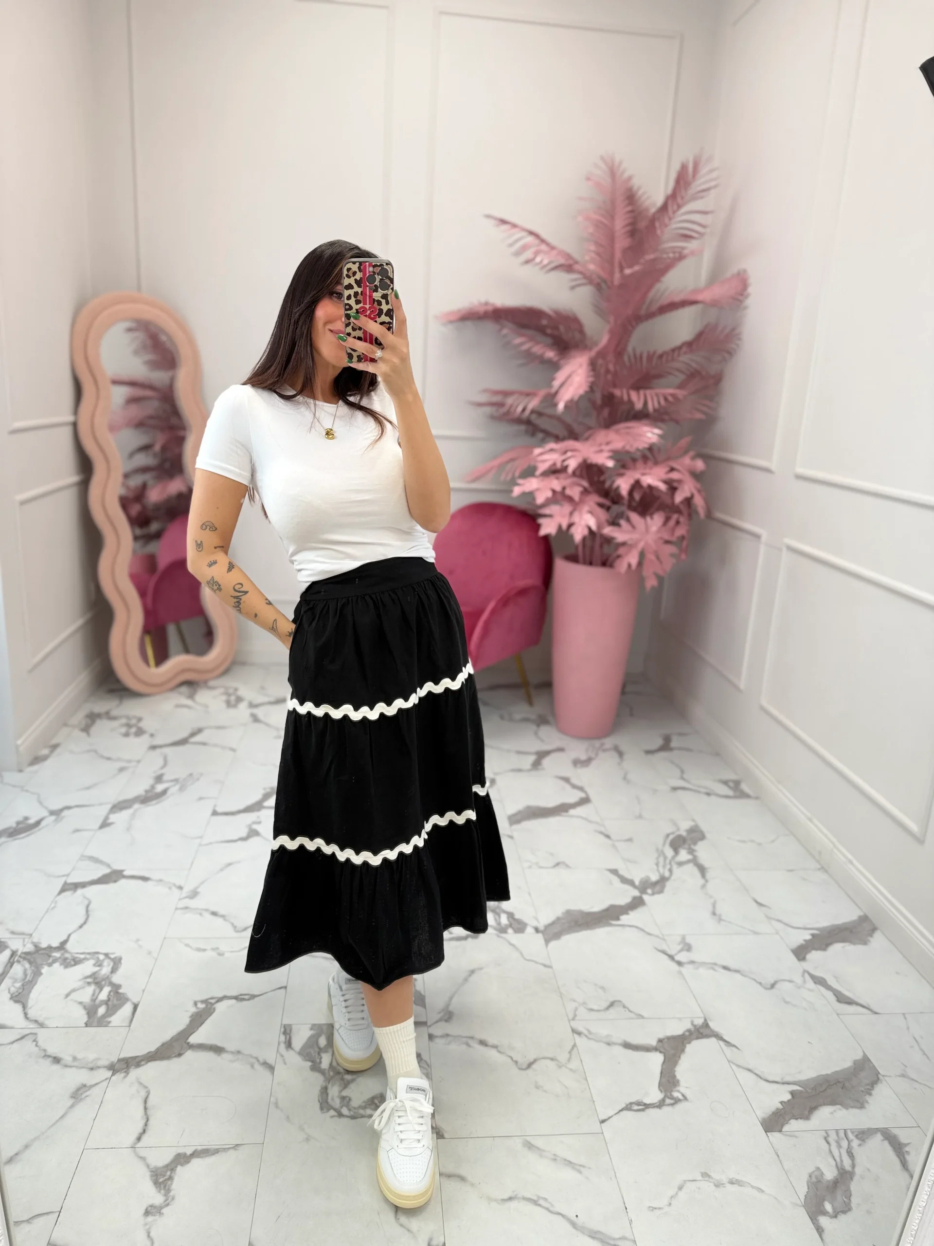 Gonna modello longuette, a ruota, con applicazioni , presenta rouches sul fondo, elastico in vita e tasche. Vestibilità regolare, la modella indossa taglia XS.