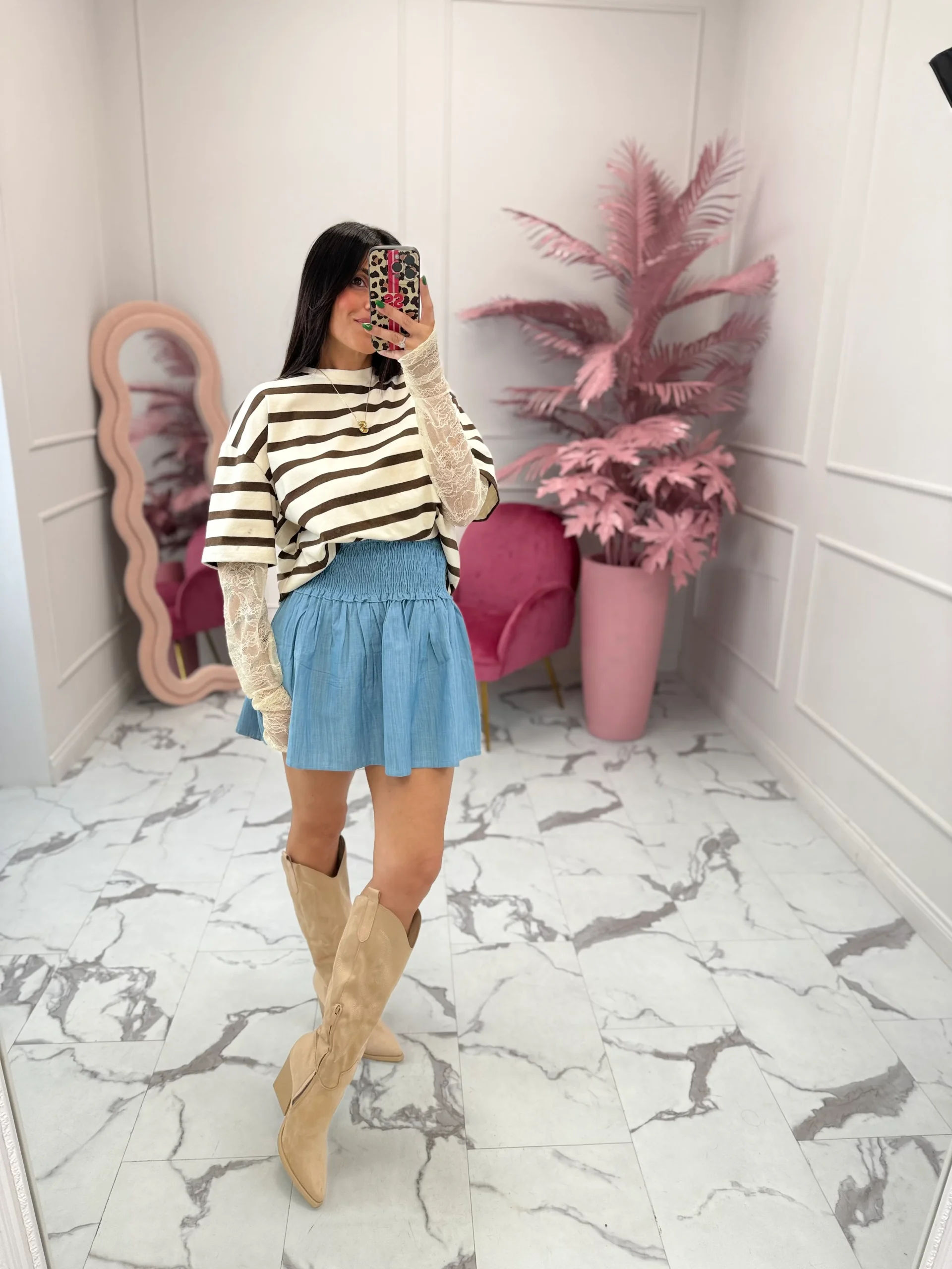 Gonna svasata corta, con elastico in crepe in vita, vestibilità regolare. La modella è alta 160cm e indossa taglia XS.