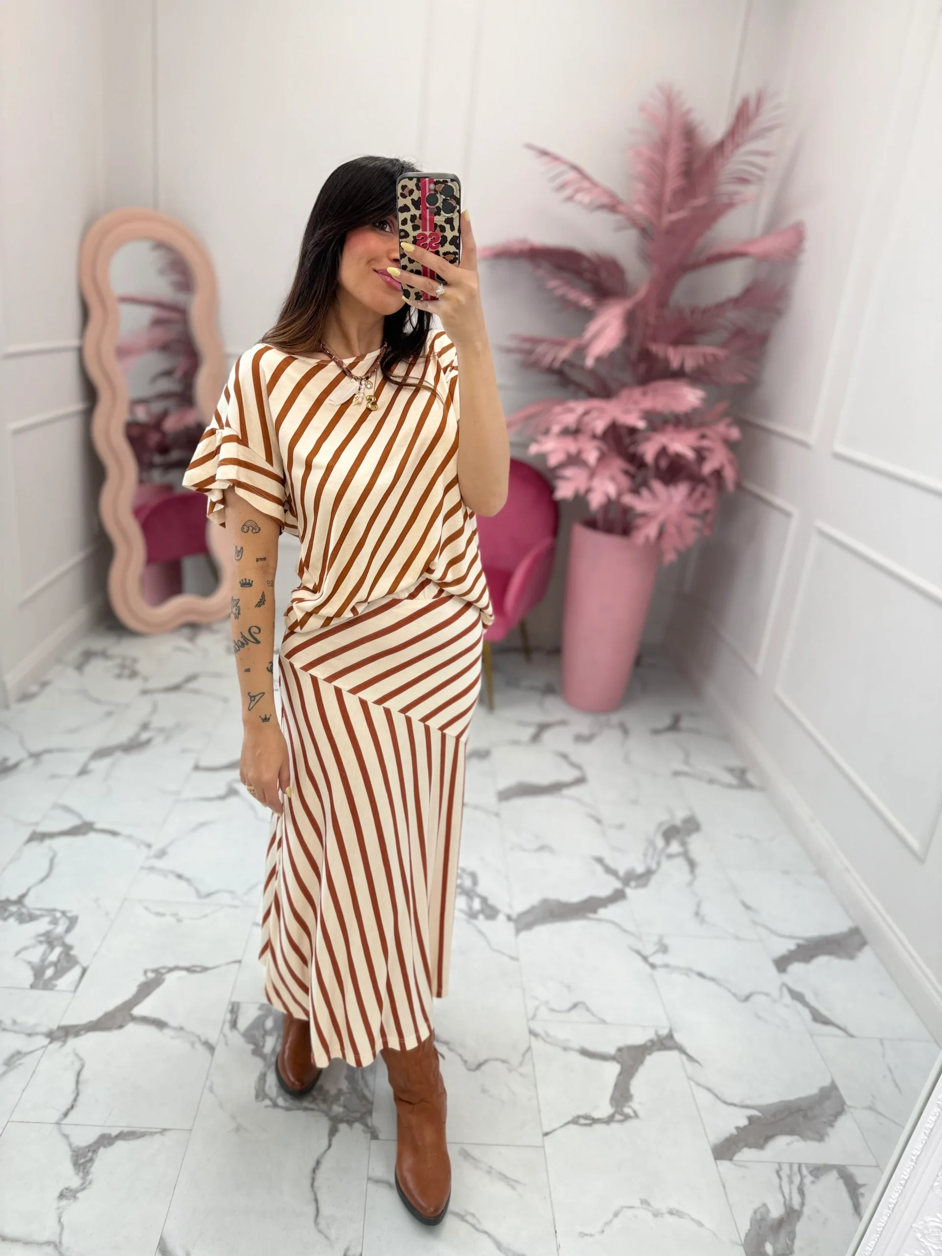 Gonna modello dritto, in fantasia rigata. Presenta elastico in vita. Vestibilità regolare, la modella indossa taglia XS. composizione: 100% viscosa.