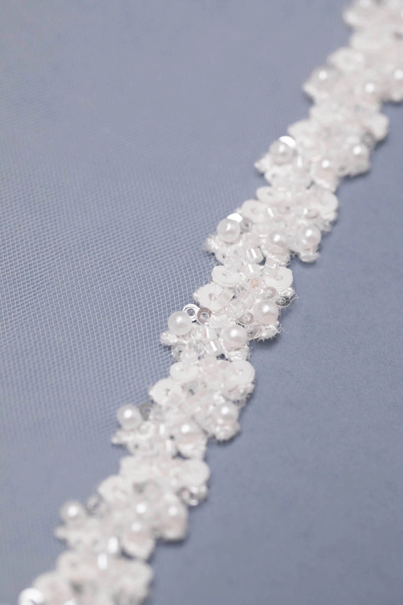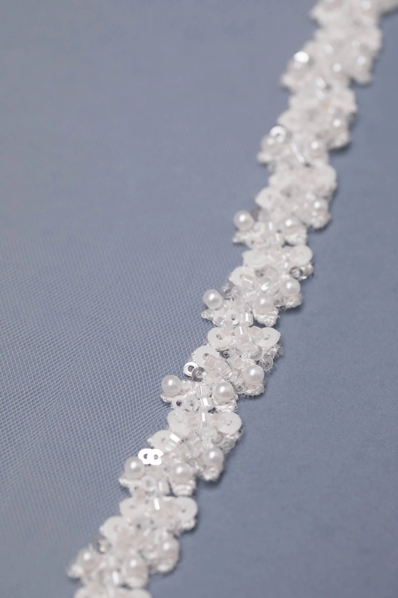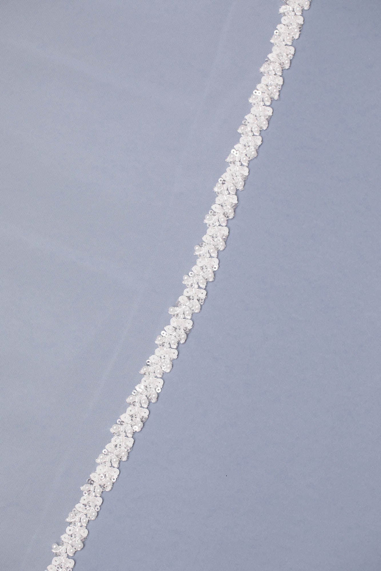 Velo in tulle lungo con bordo ricamato con cristalli e perle.