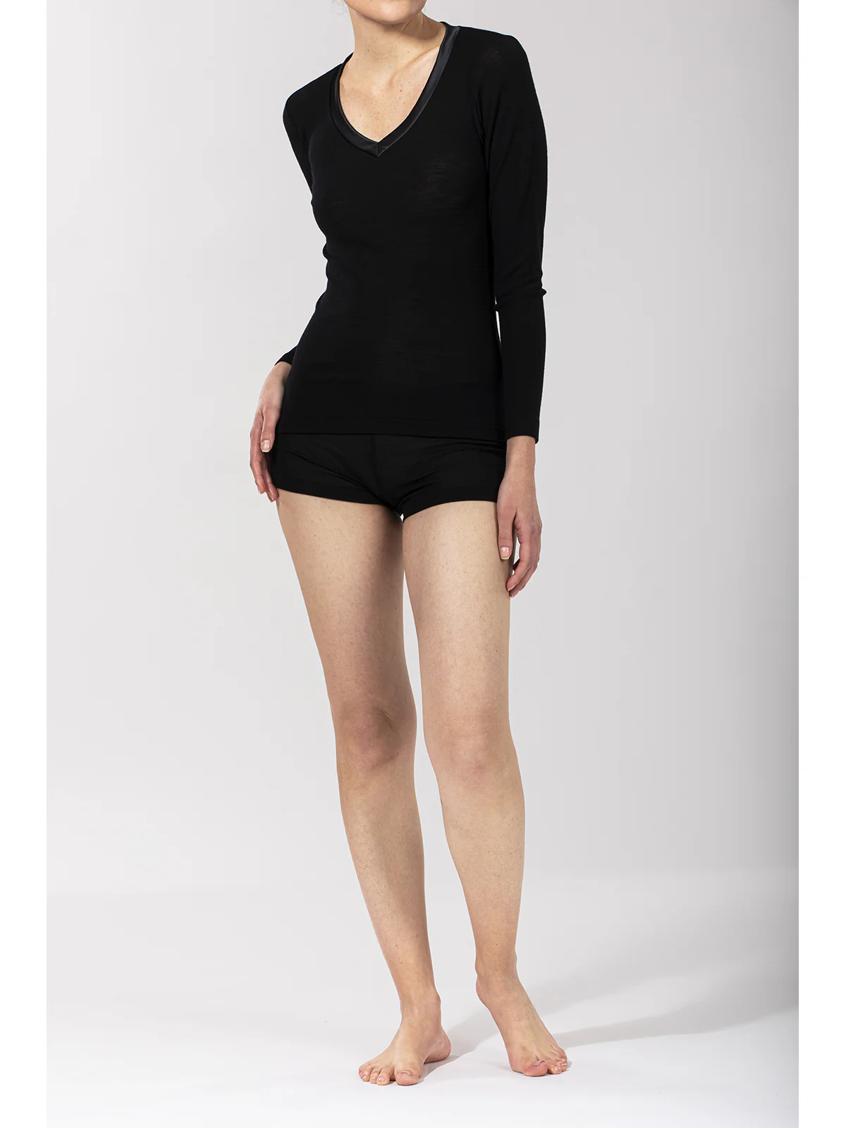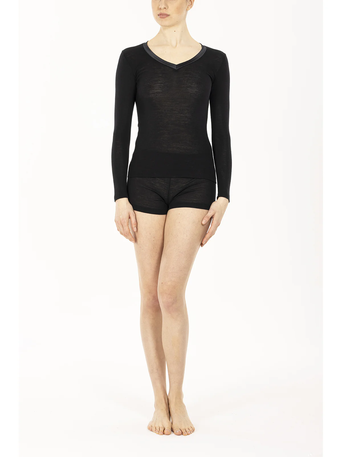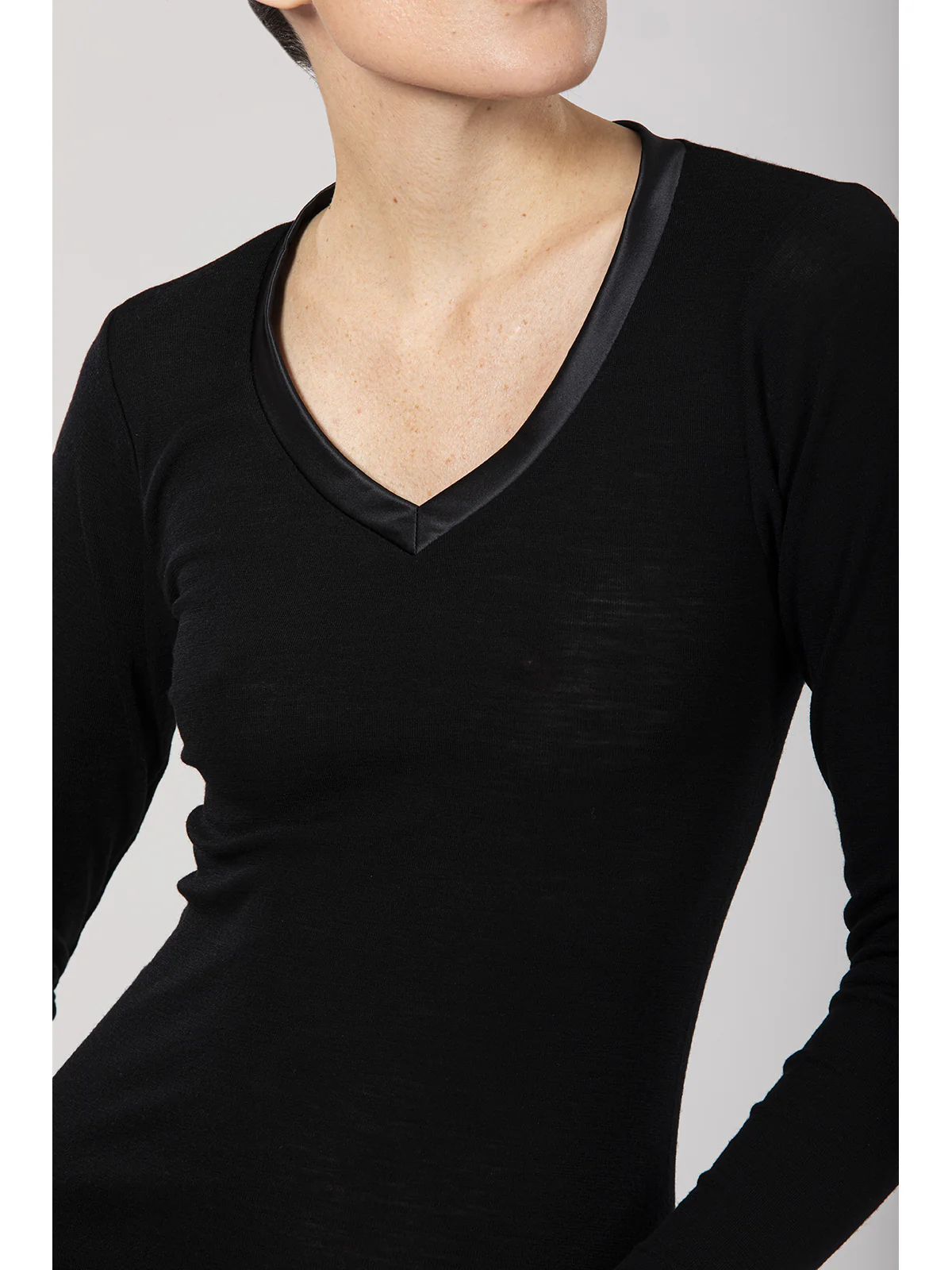 Maglietta intima donna modello a manica lunga in lana e seta per un massimo comfort e calore. Elegante scollo in raso. Tutto il tepore della lana senza rinunciare alla lucentezza della seta. Sulla tua pelle solo fibre naturali.