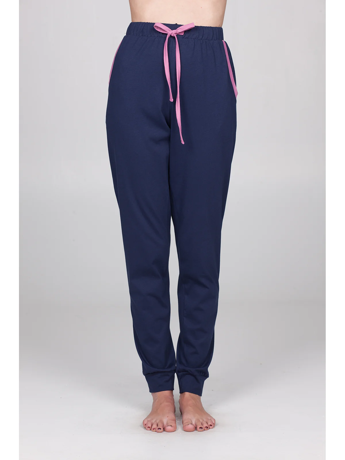Pantalone donna in jersone 24/1 di puro cotone: naturale e traspirante per una pelle sana. Modello con coulisse e con tasche laterali in tinta unita, con bordi al fondo. Pratico, comodo e sportivo per una perfetta libertà di movimento.