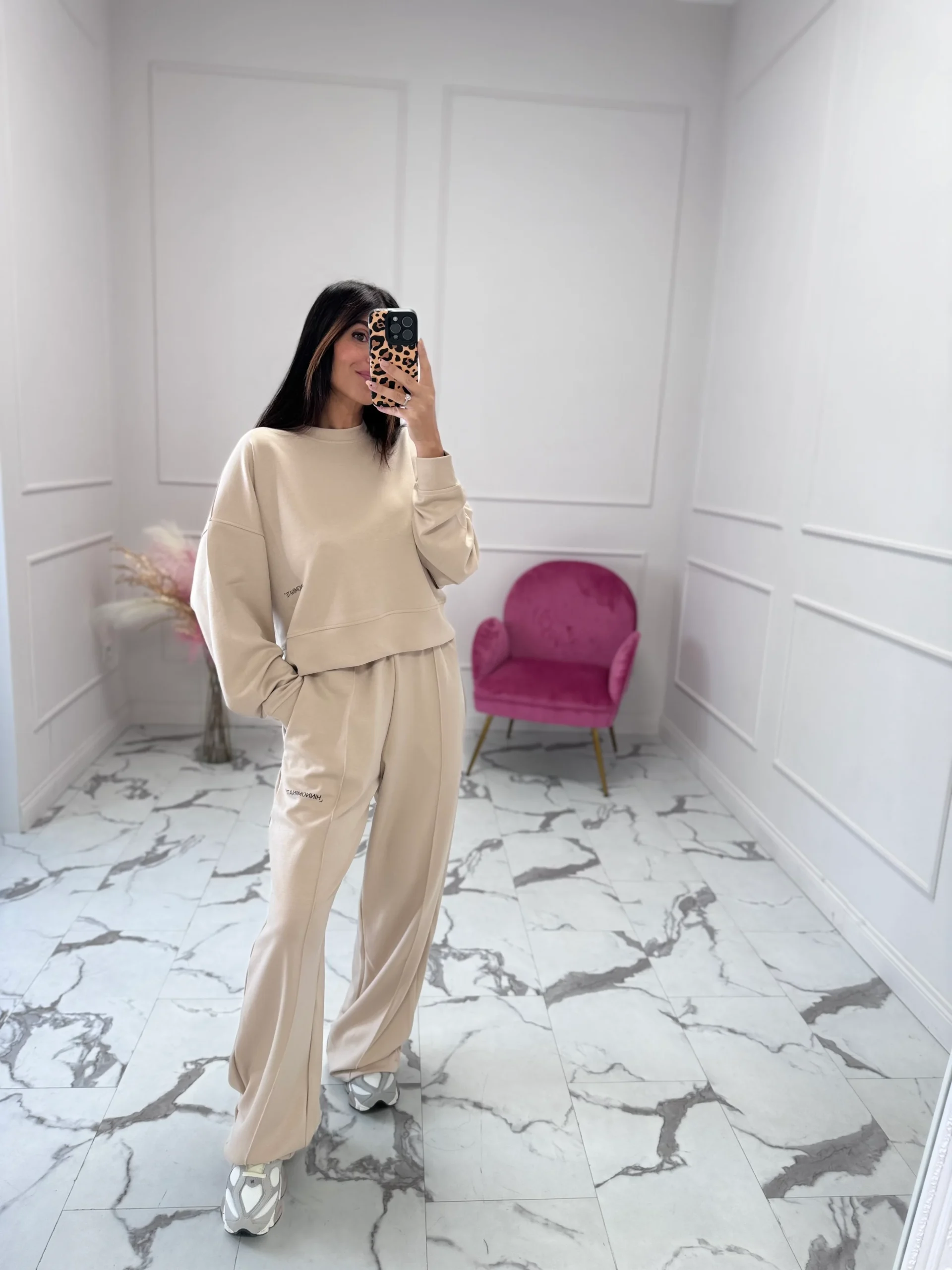 Pantalone a palazzo, vita alta in tessuto interlock presenza di elastico in vita e nella parte frontale gamba sinistra,stampa logo. Vestibilità regolare. La modella indossa taglia XS. composizione: 46%poliestere-46%modal-8% elastane / interno: 100% cotone