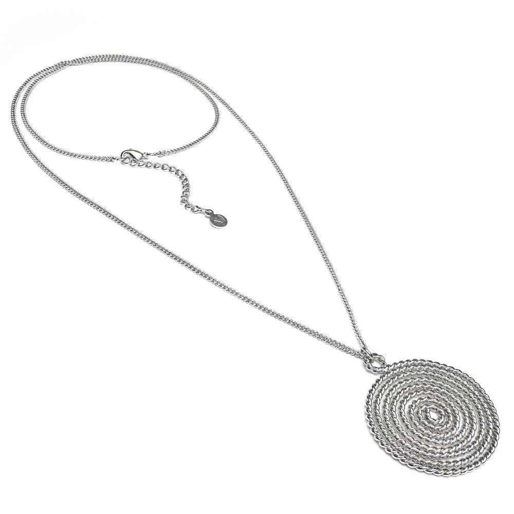 Collana modello pendente. Ciondolo a forma di spirale spiatta effetto torchon. Lunghezza 80 cm. Extra chain 6,5 cm. Diametro pendente 4,3 cm circa. Chiusura regolabile con moschettone. Placcato in argento. Nickel tested. Gioielli fatti a mano, unici e artigianali, perfetti per tutti i tuoi look o come idea regalo.