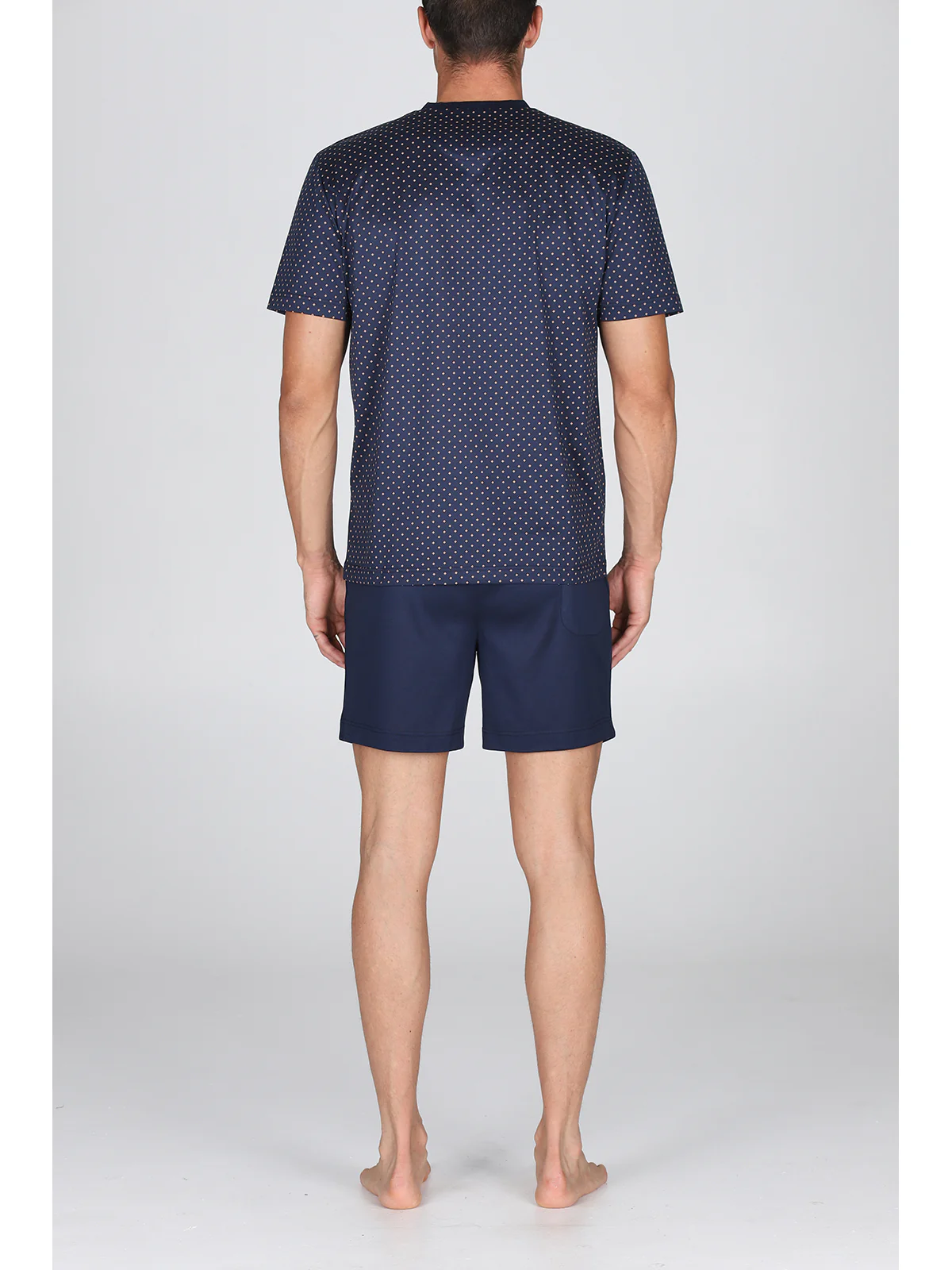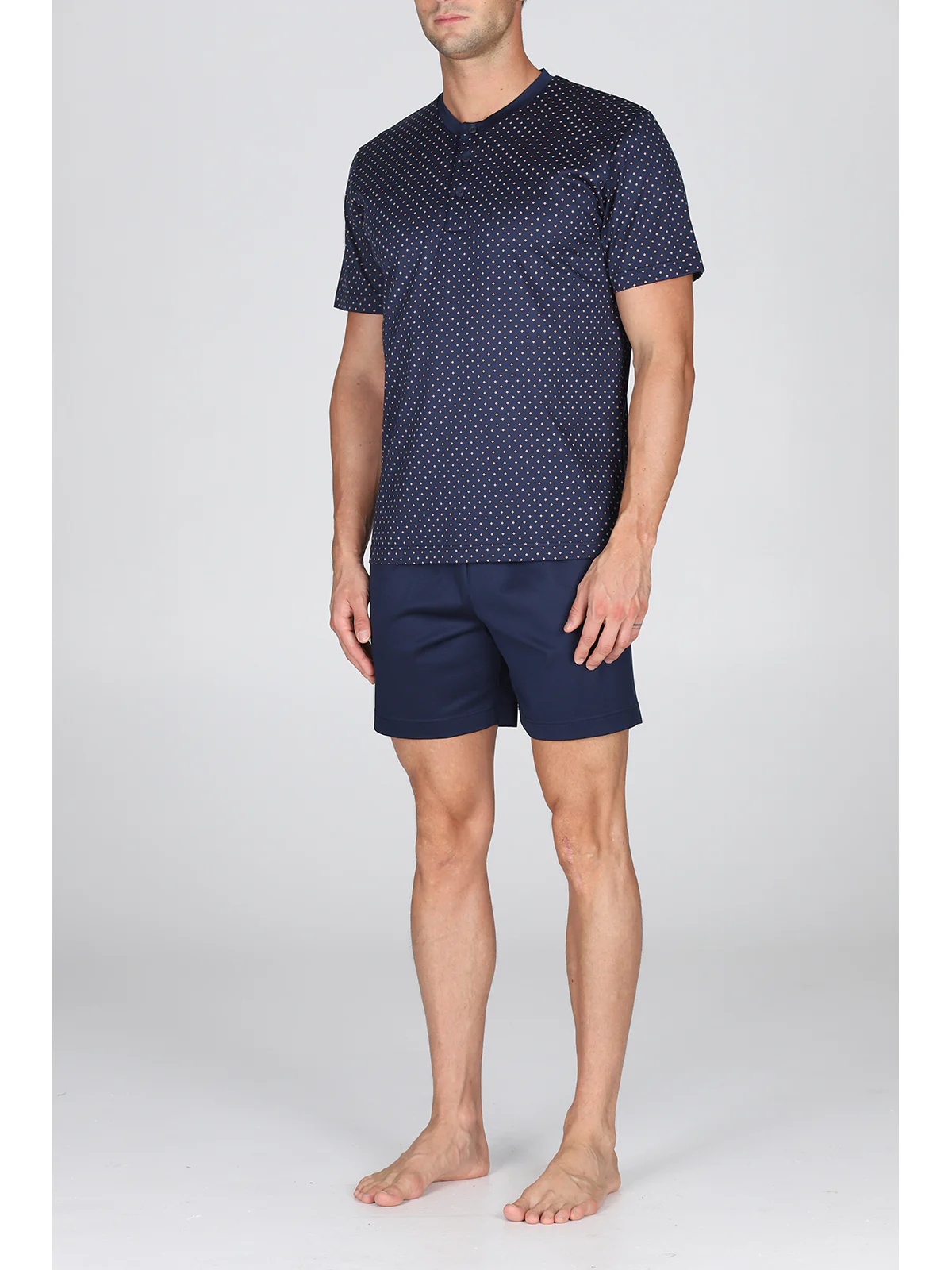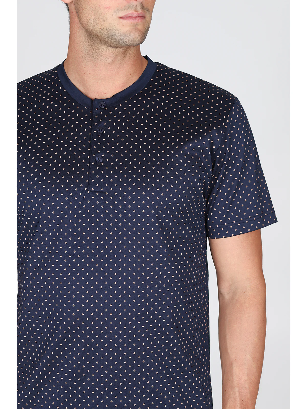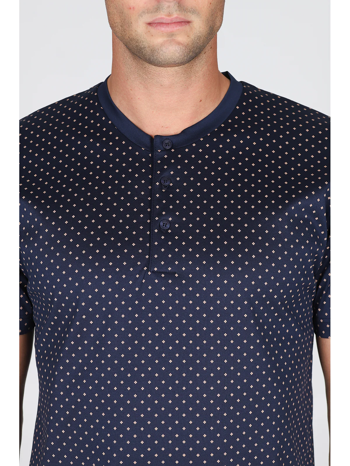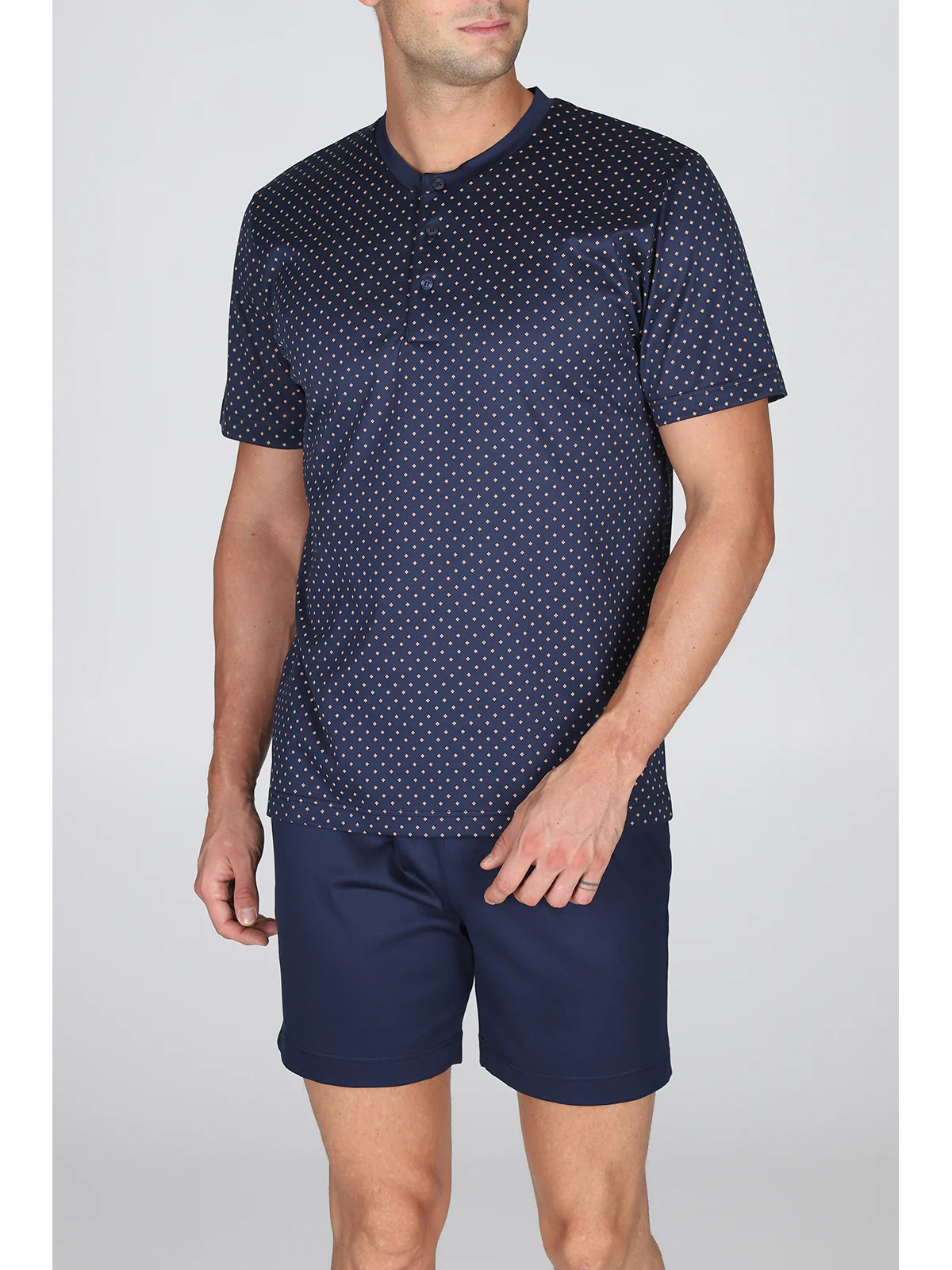 Maglia serafino a manica corta Fantasia cravatteria Pantaloncino in tinta unita Peso leggero per un connubio di comfort e raffinatezza Esclusivo jersey leggero, lucido e consistente Perfetta definizione dei disegni e tocco impalpabile