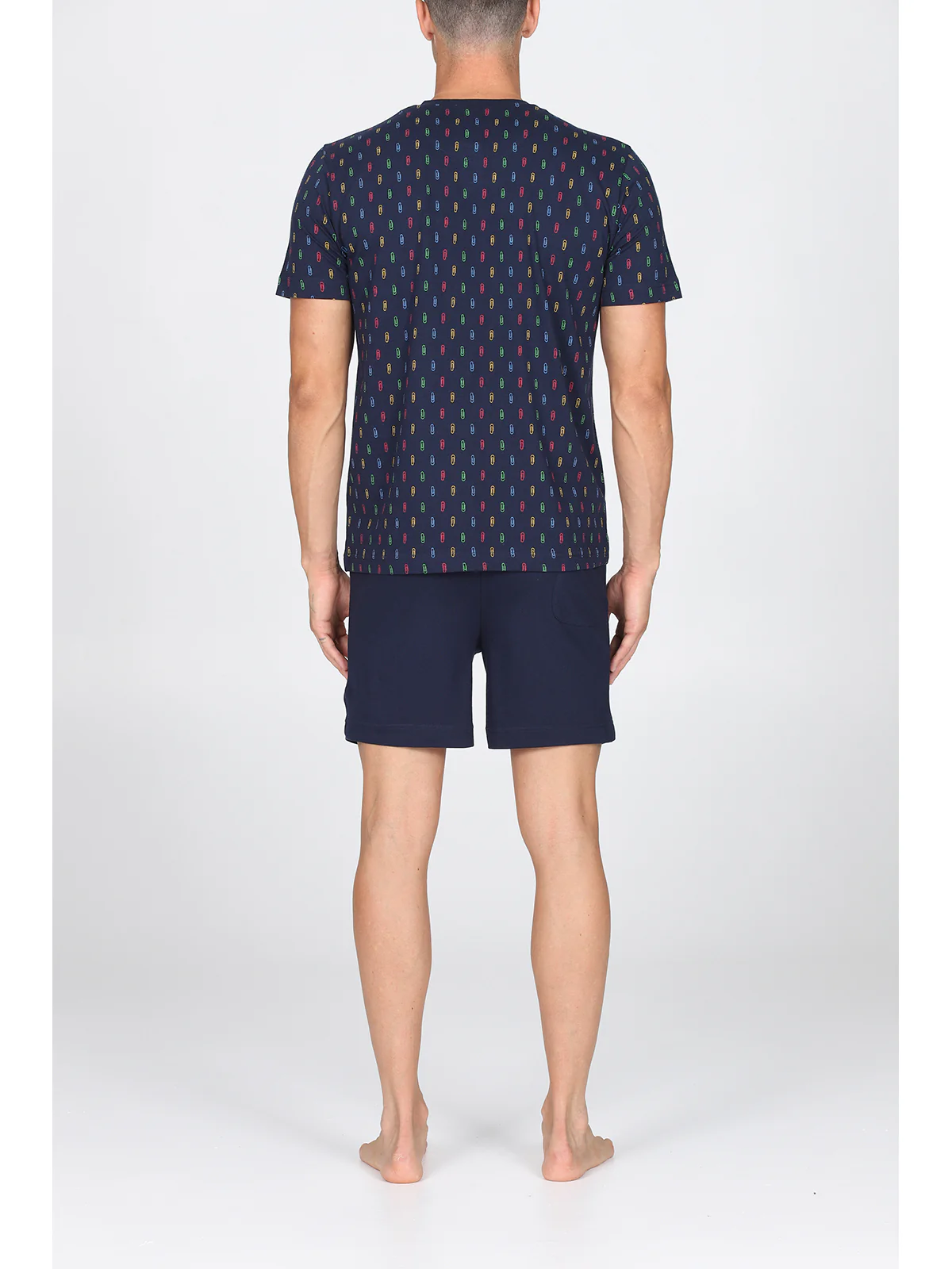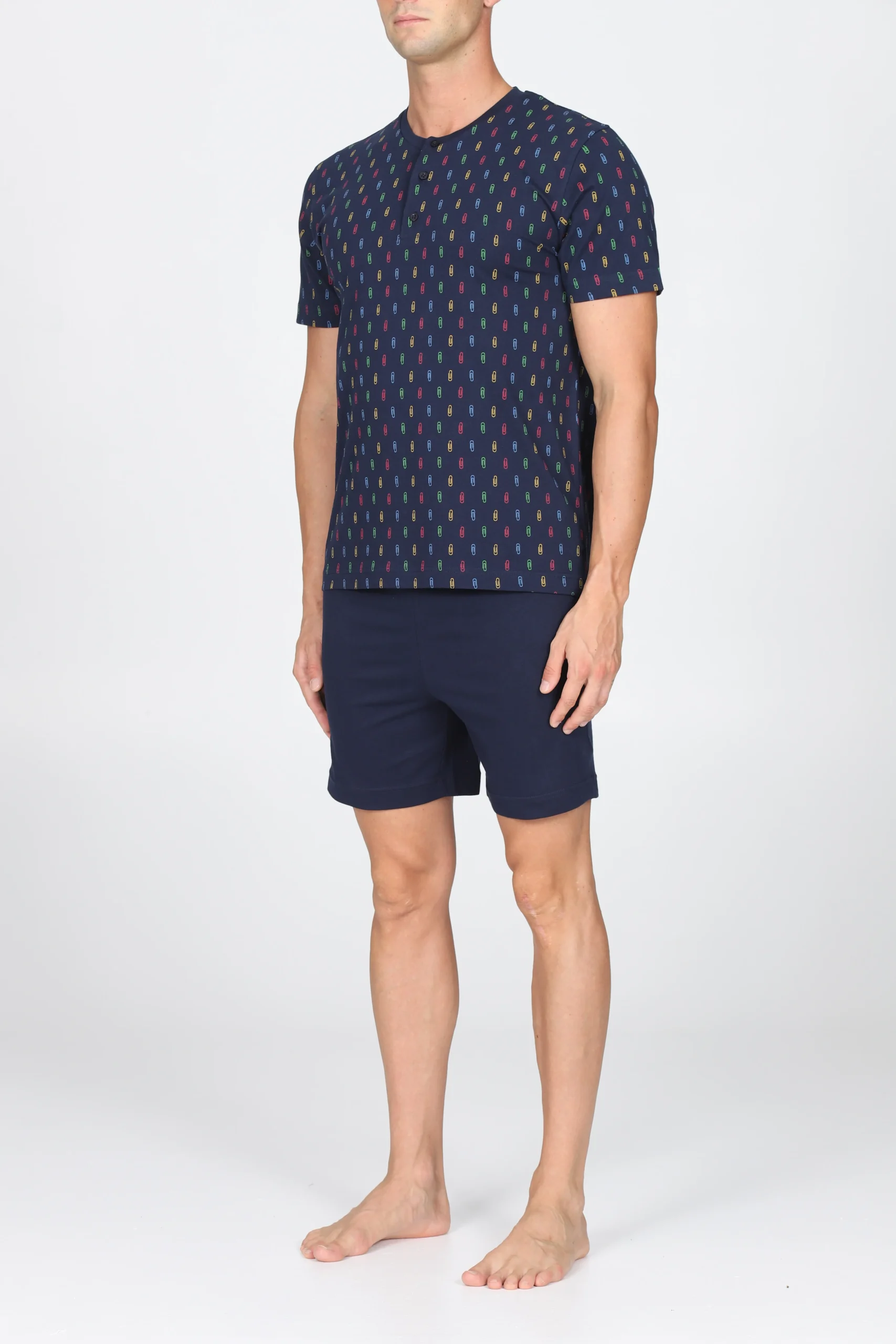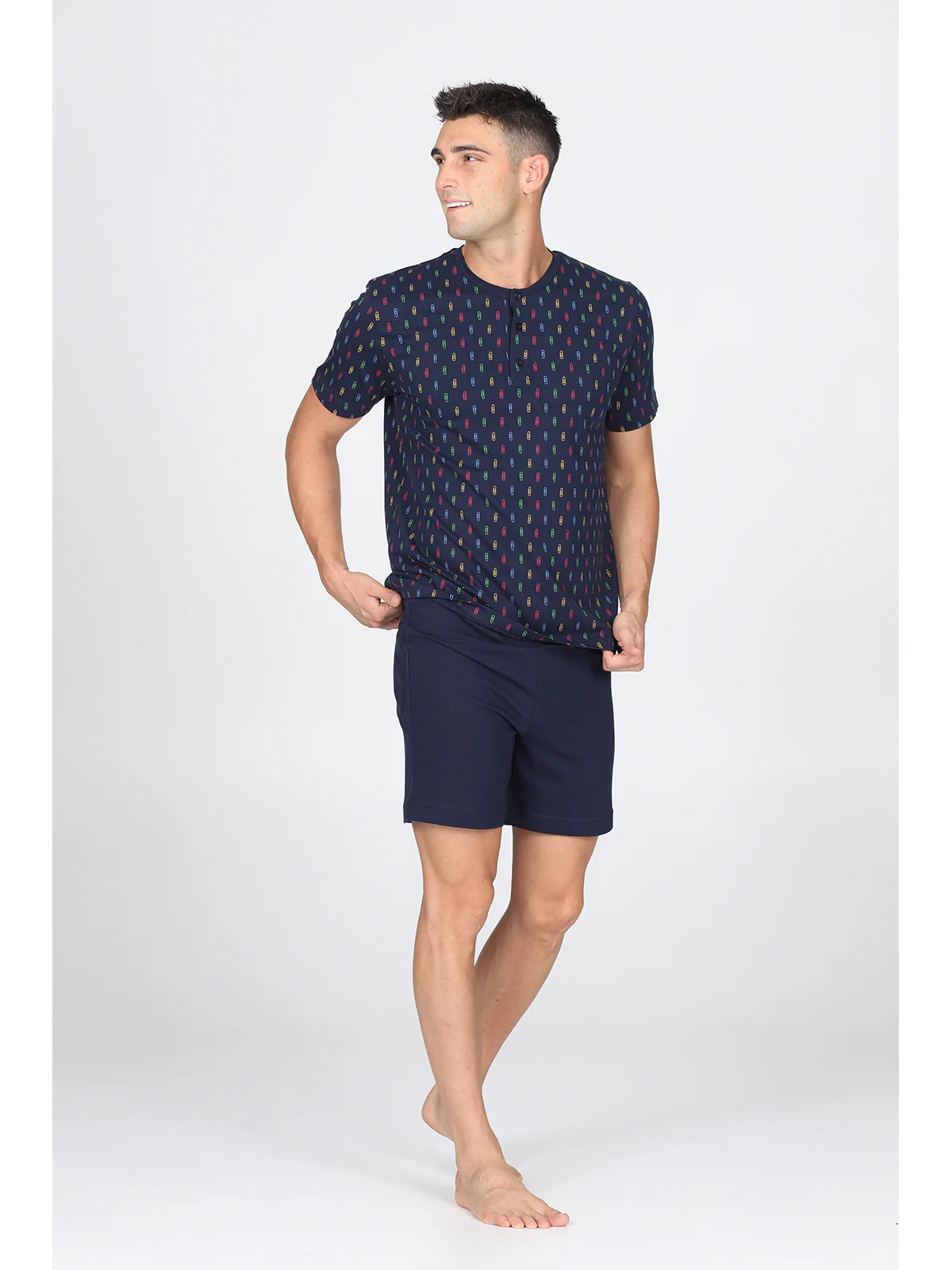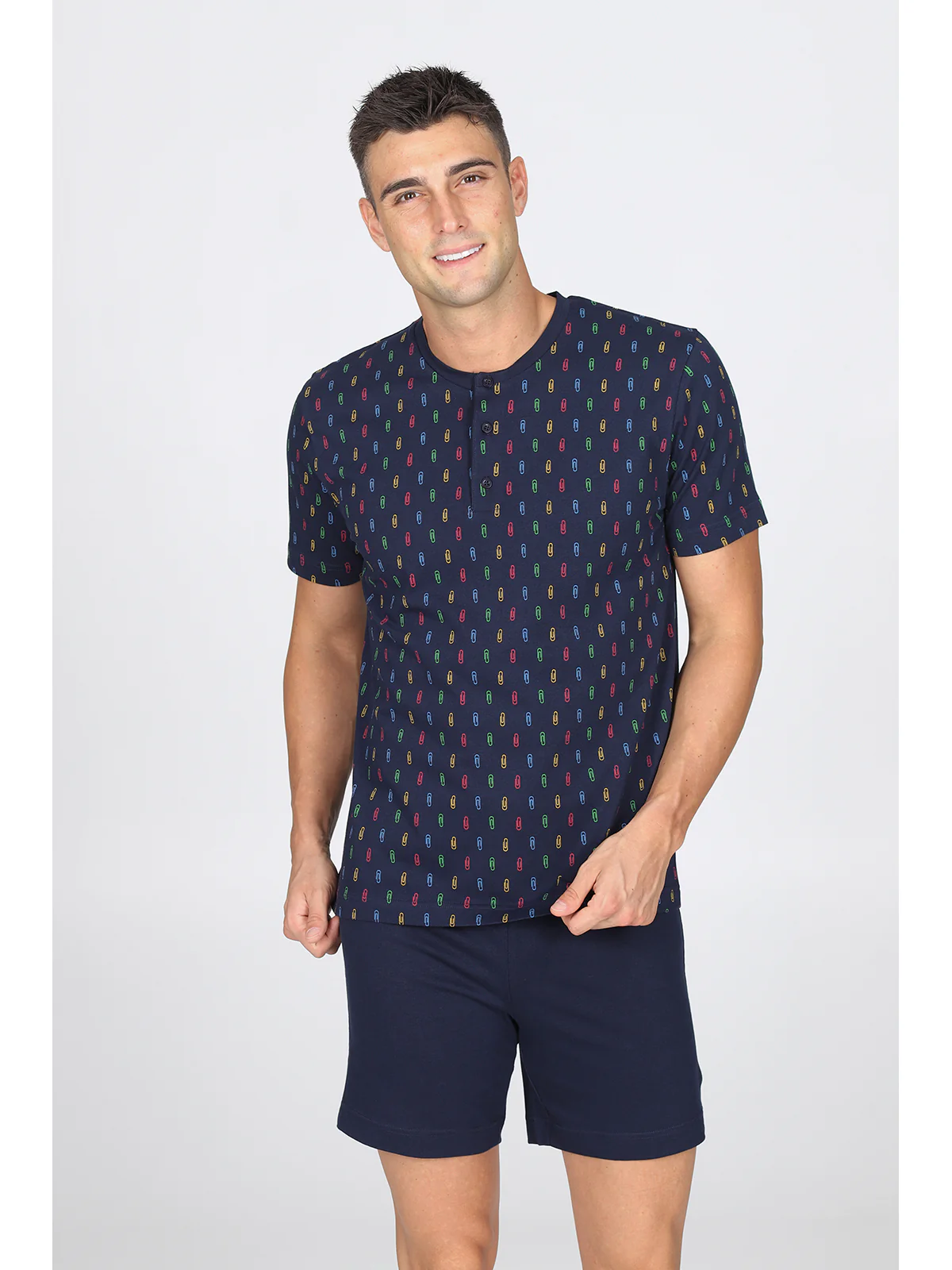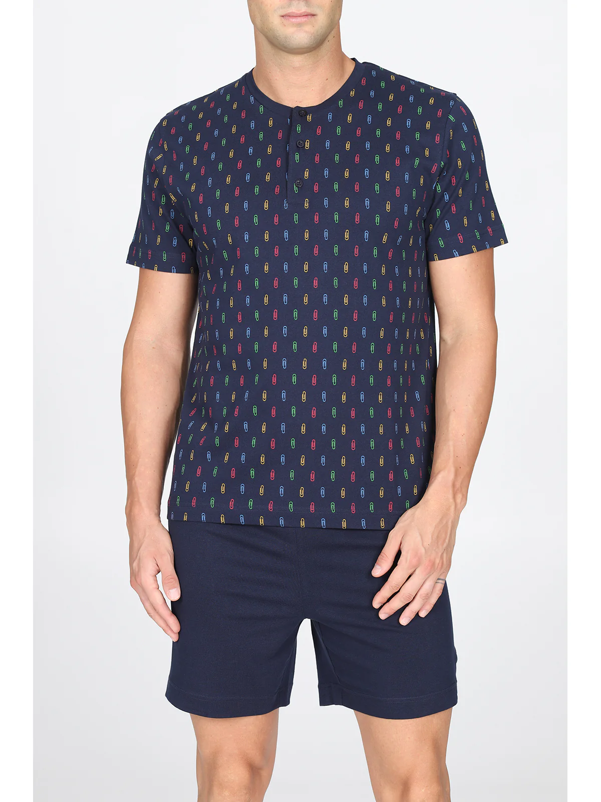 Maglia serafino manica corta, fantasia graffette Pantalone corto con polsini Doppia torsione del filato sz per garantire traspirabilità e freschezza No torsioni dei tessuti ai lavaggi Perfetta definizione del disegno Esclusivo disegno graffette