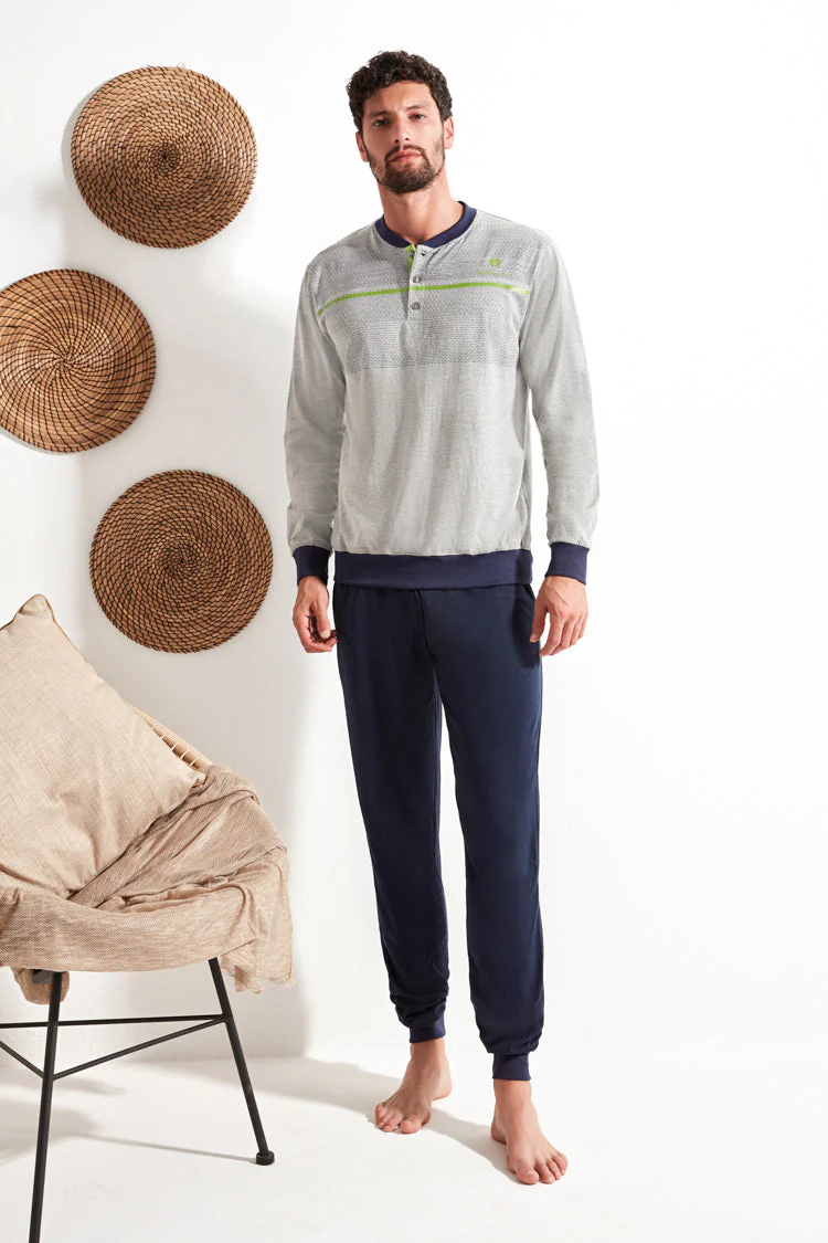 Comodo, pratico e dal design moderno, questo pigiama lungo da uomo e’ realizzato in cotone morbido e traspirante, perfetto per offrire calore leggero e una piacevole sensazione sulla pelle durante le notti piu’ fresche. Composizione : 100%cotone