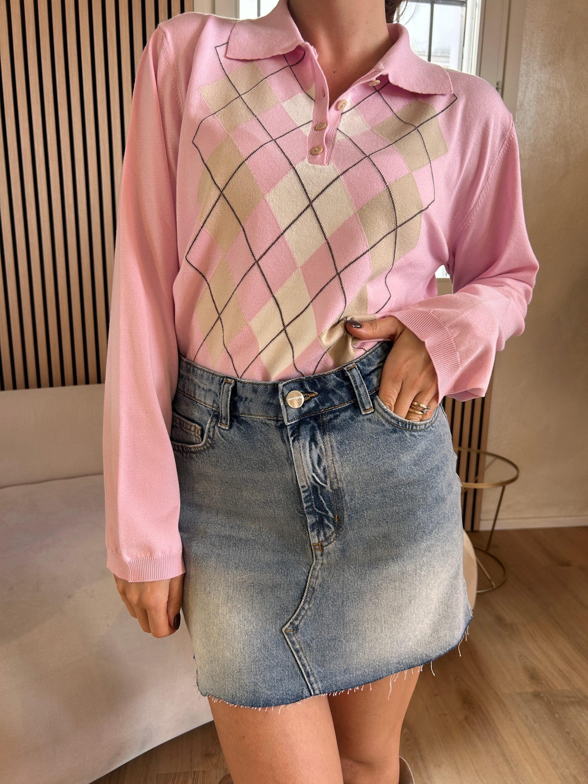 Polo di Kontatto con manica lunga e bottoncini. Fantasia rombi nel rosa e beige in taglia unica dalla 38 alla 42.