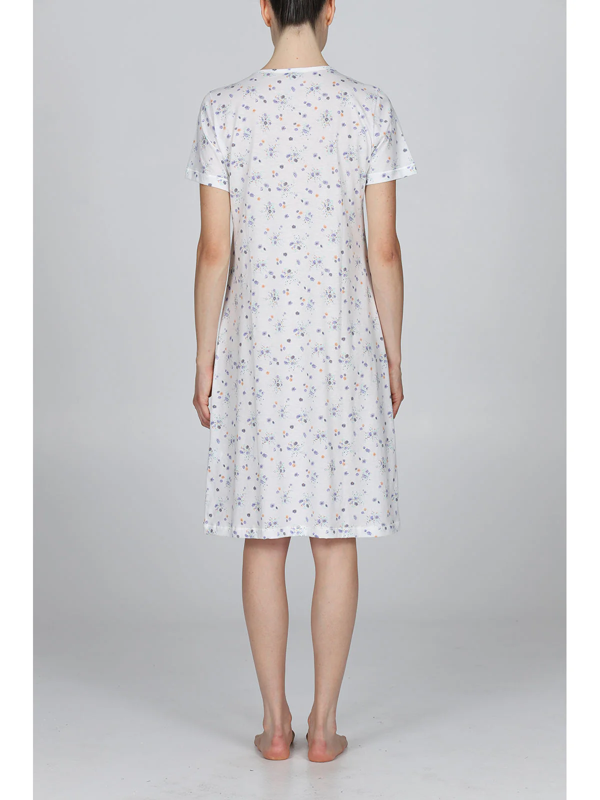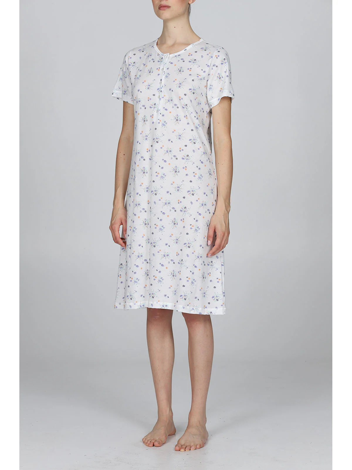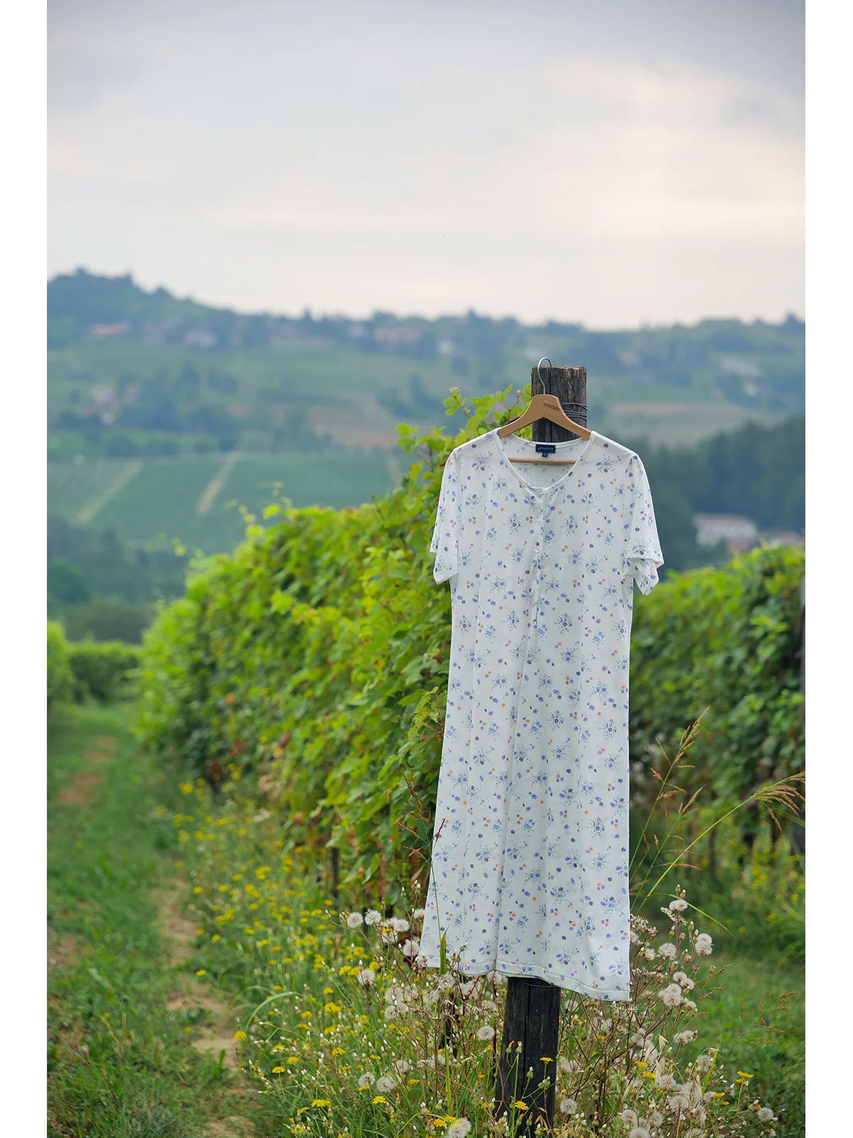 Camicia da notte donna in fresco jersey 36/1 di puro cotone pettinato. Tessuto in raffinata fantasia floreale. Modello serafino con apertura profonda. Comfort classico per una femminilità moderna firmata Alpina. SERAFINO CON APERTURA PROFONDA MANICA CORTA ROMANTICA FANTASIA FLOREALE LUNGHEZZA CM.100 PRATICO E CONFORTEVOLE MORBIDO E NATURALE PURO COTONE TRASPIRANTE