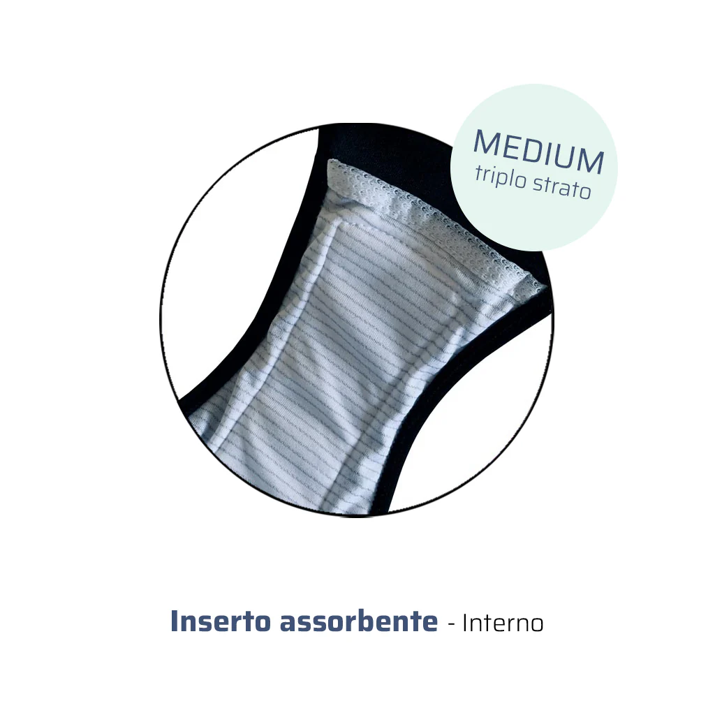 Gli slip MEDIUM sono dotati di un inserto assorbente a triplo strato interno (non intercambiabile) e sono ideali per perdite di media entità.