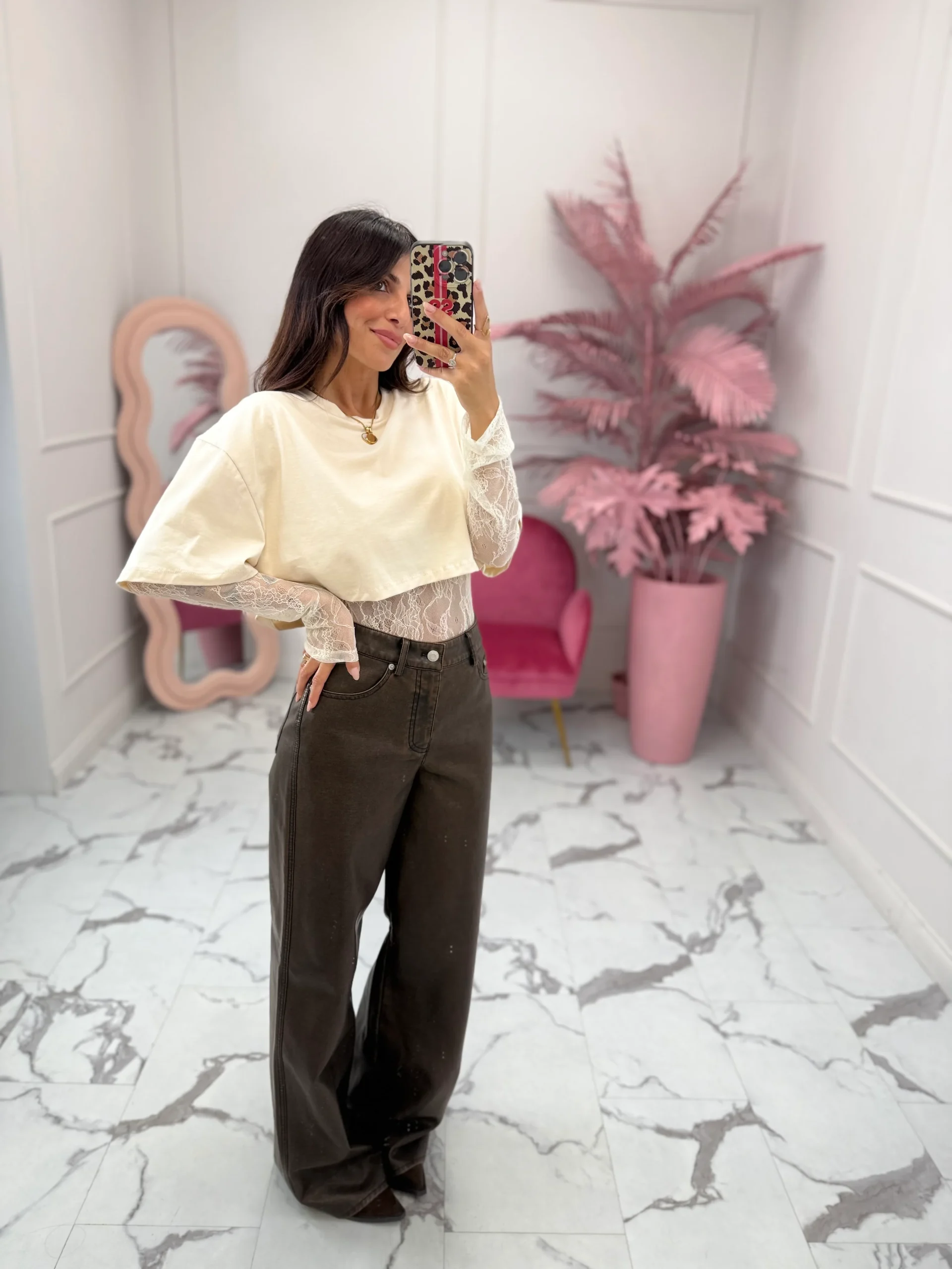 T-shirt, girocollo, modello crop a scatolina, con body e maniche in pizzo incorporati. Vestibilità regolare, la modella è alta 160cm e indossa la taglia S.
