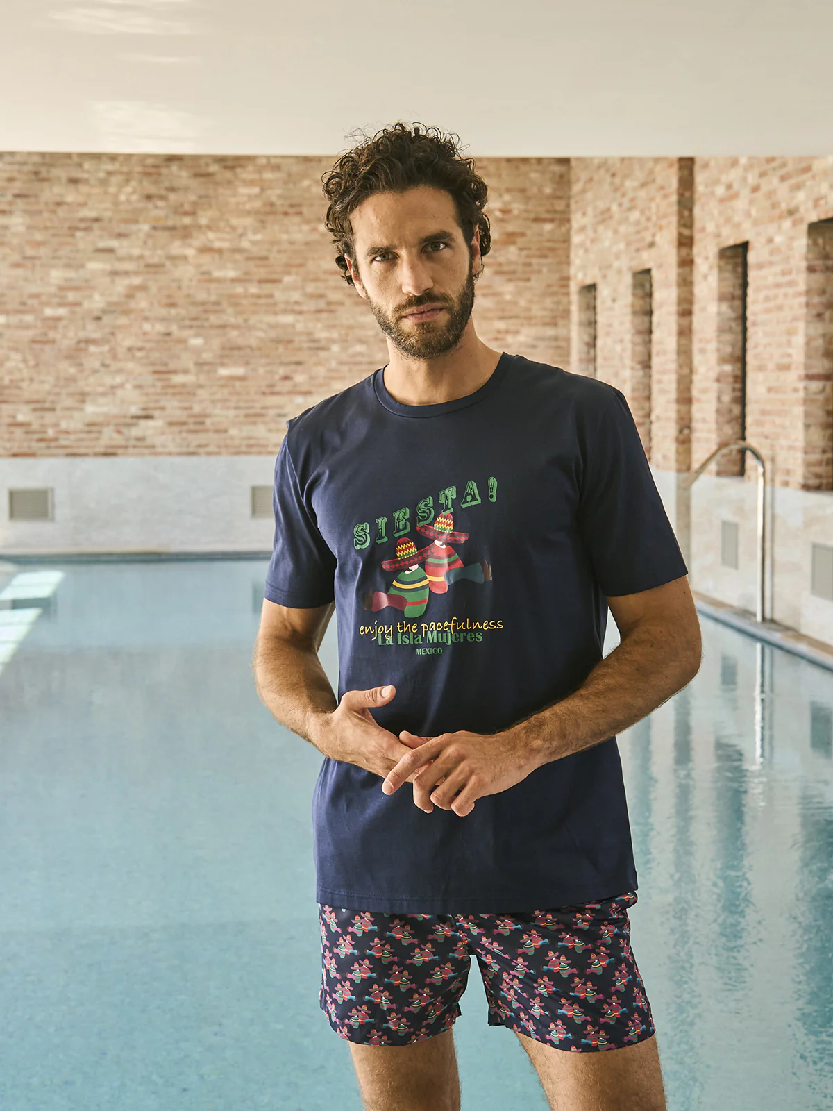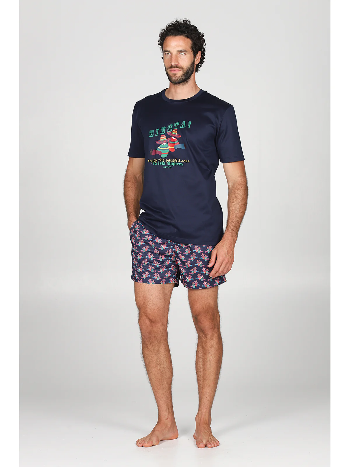 Maglietta uomo a manica corta Stampa piazzata sul davanti ” siesta” Vestibilita’ regolare Coordinabile con boxer mare linea isla mujeres