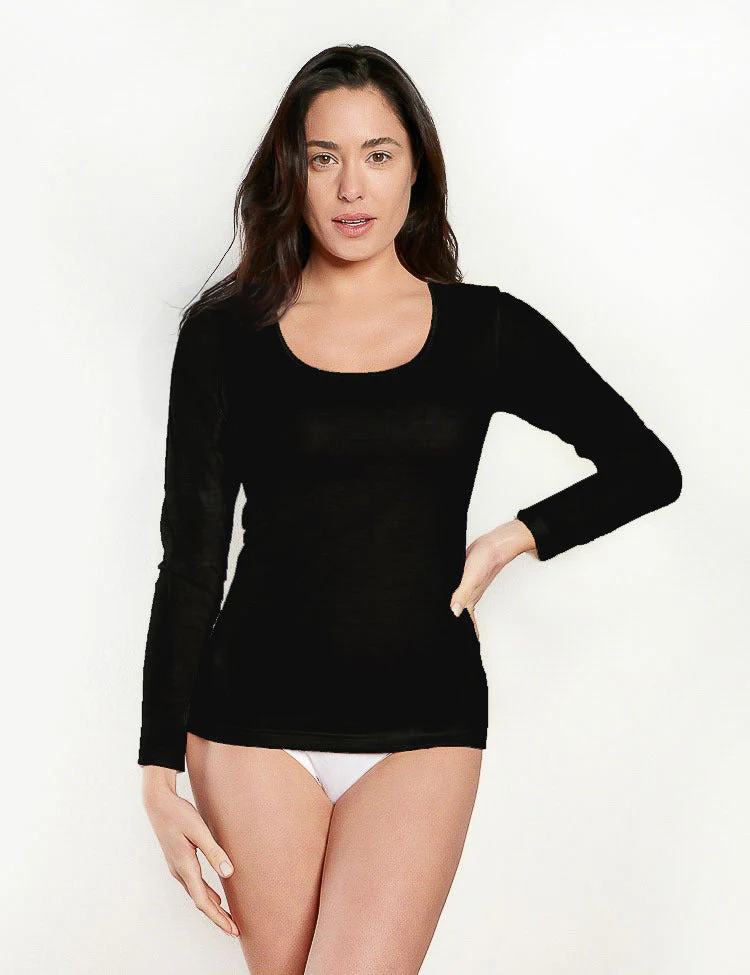 T-shirt manica lunga con bordino lucido, esterno lana e interno cotone. Composizione : Int.:100%cotone/est.:52%acrilico-40%lana-8%nylon