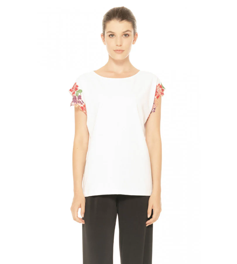 SCOLLO AMPIO MANICA CON APPLICAZIONE A RICAMO FIORI MULTICOLOR COORDINABILE CON S2L603, S2L604, S2L813