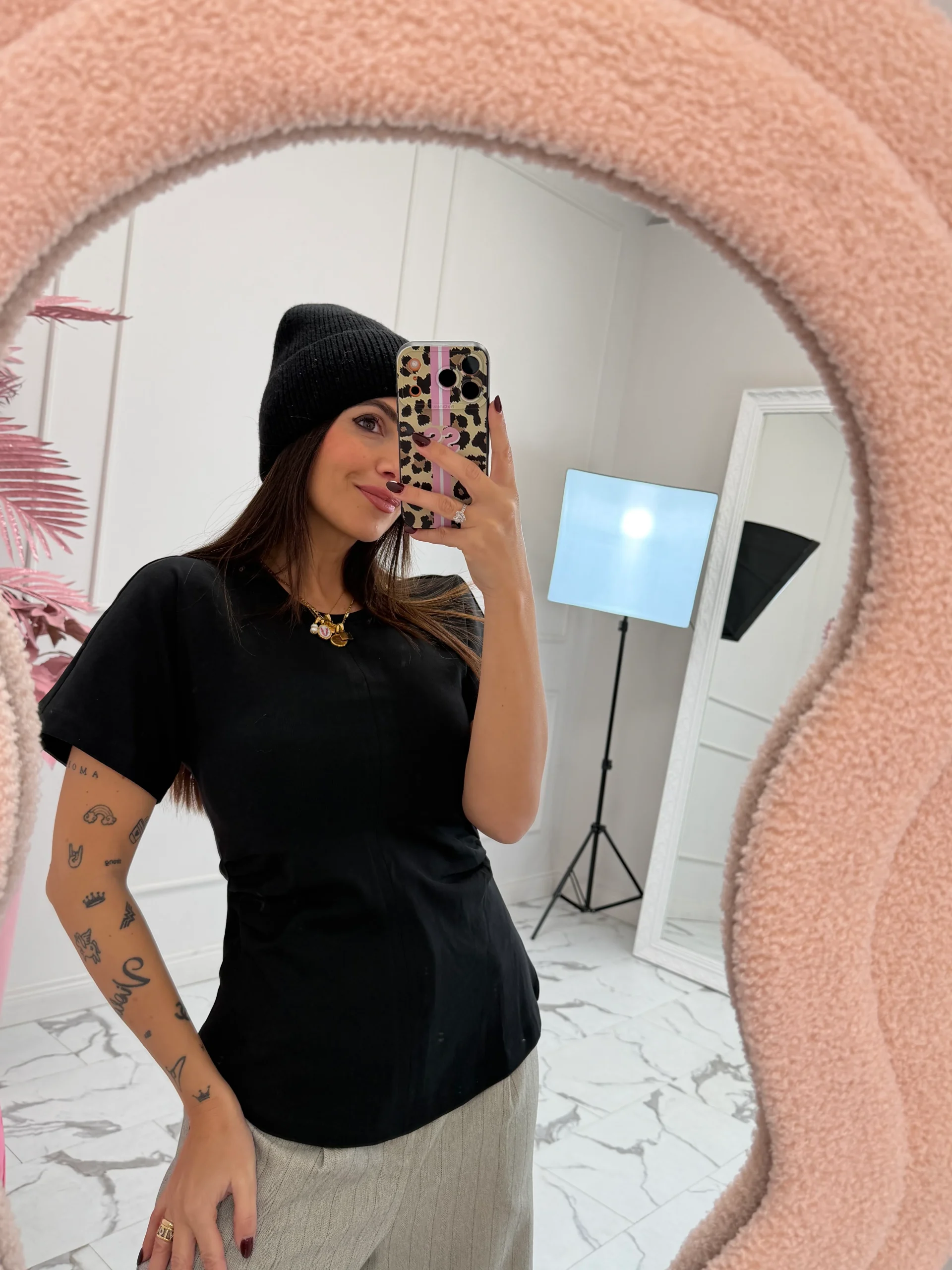 T-shirt girocollo a mezza manica avvitata in vita. Vestibilità regolare.