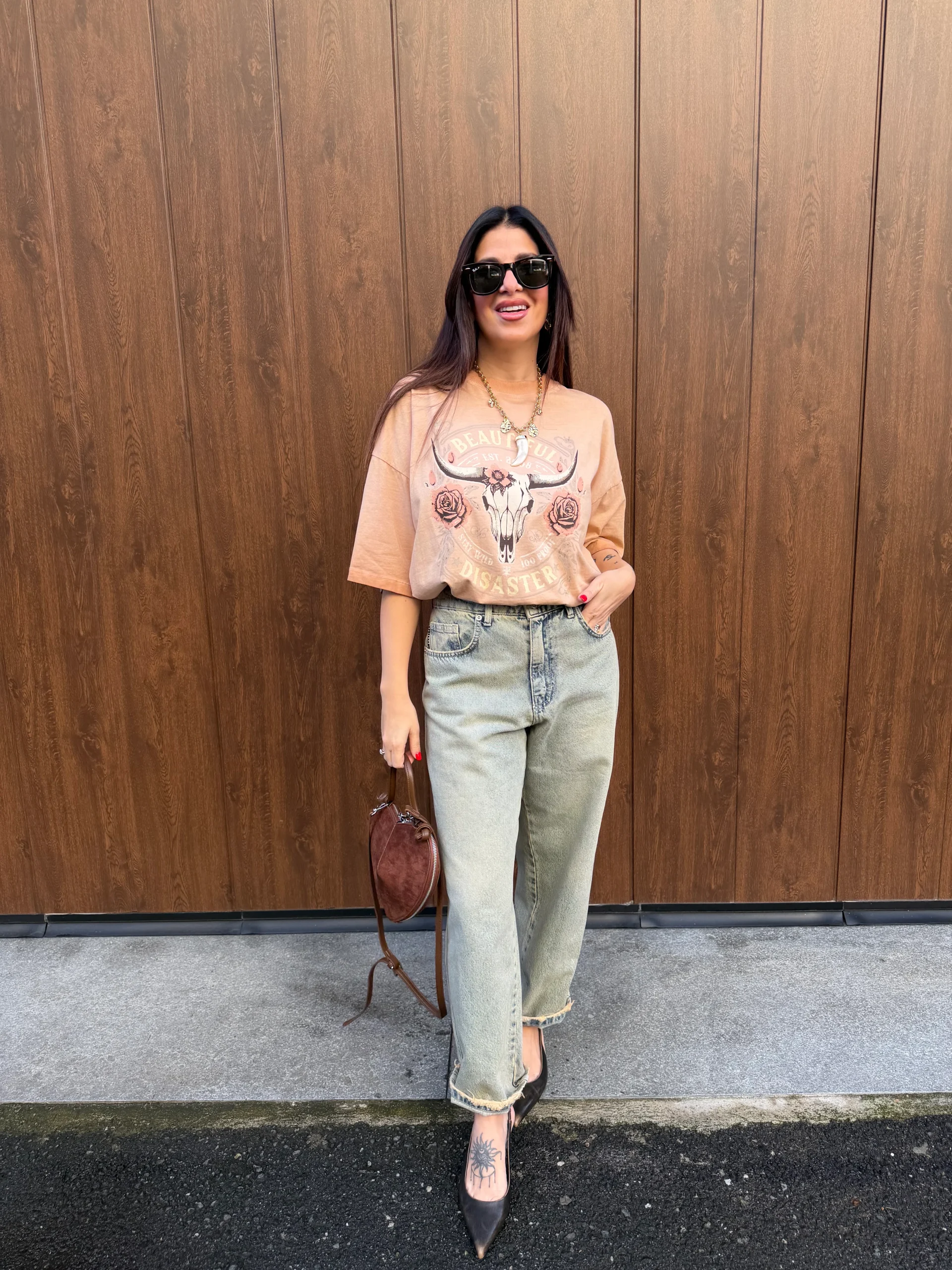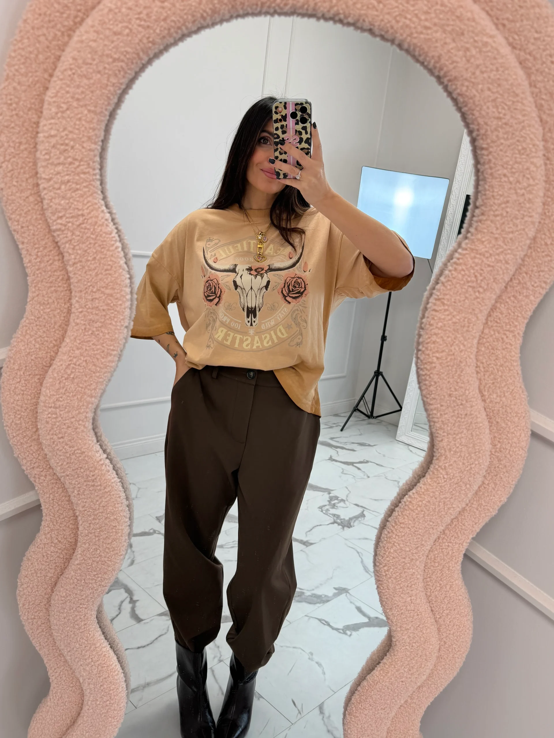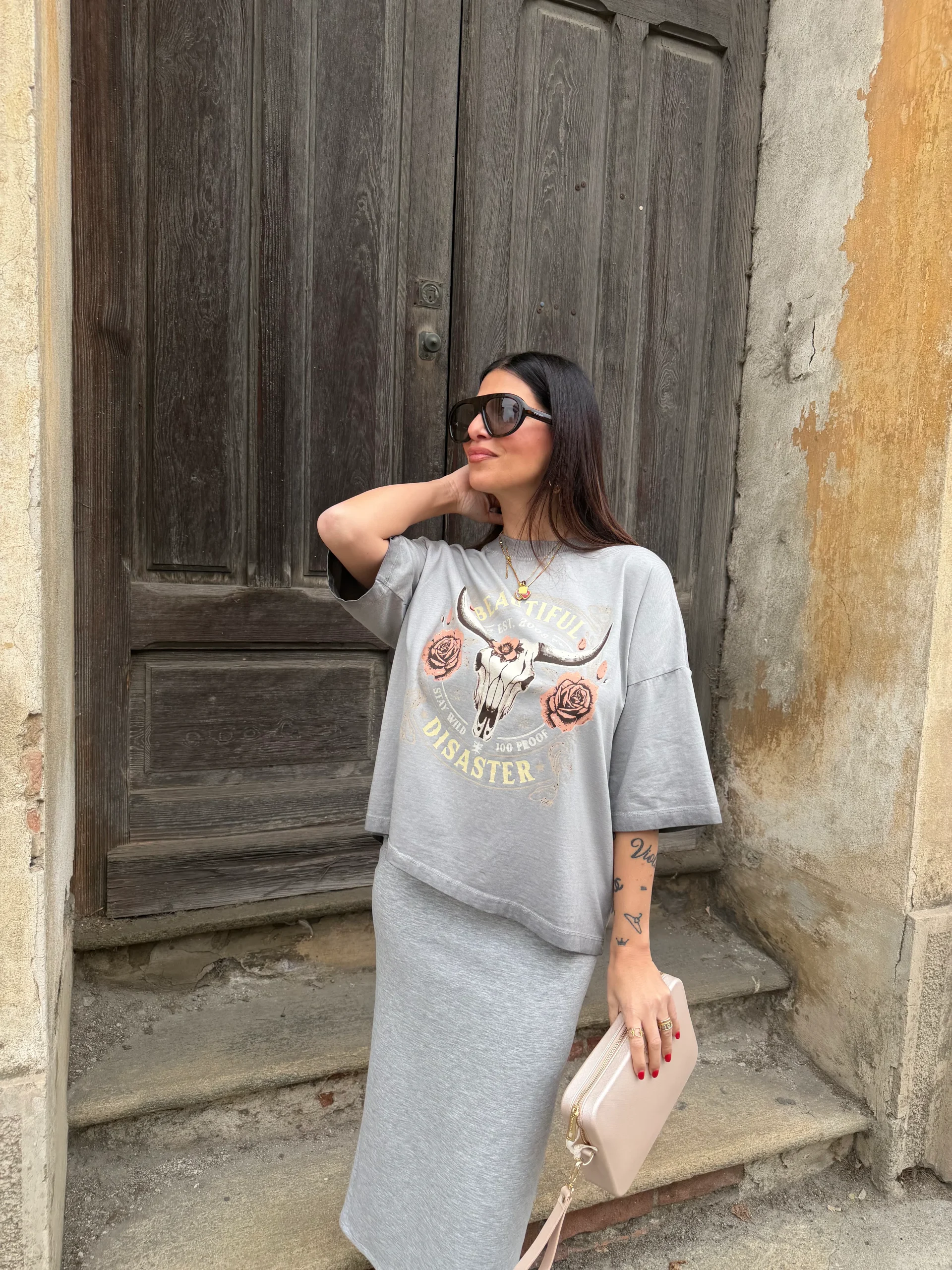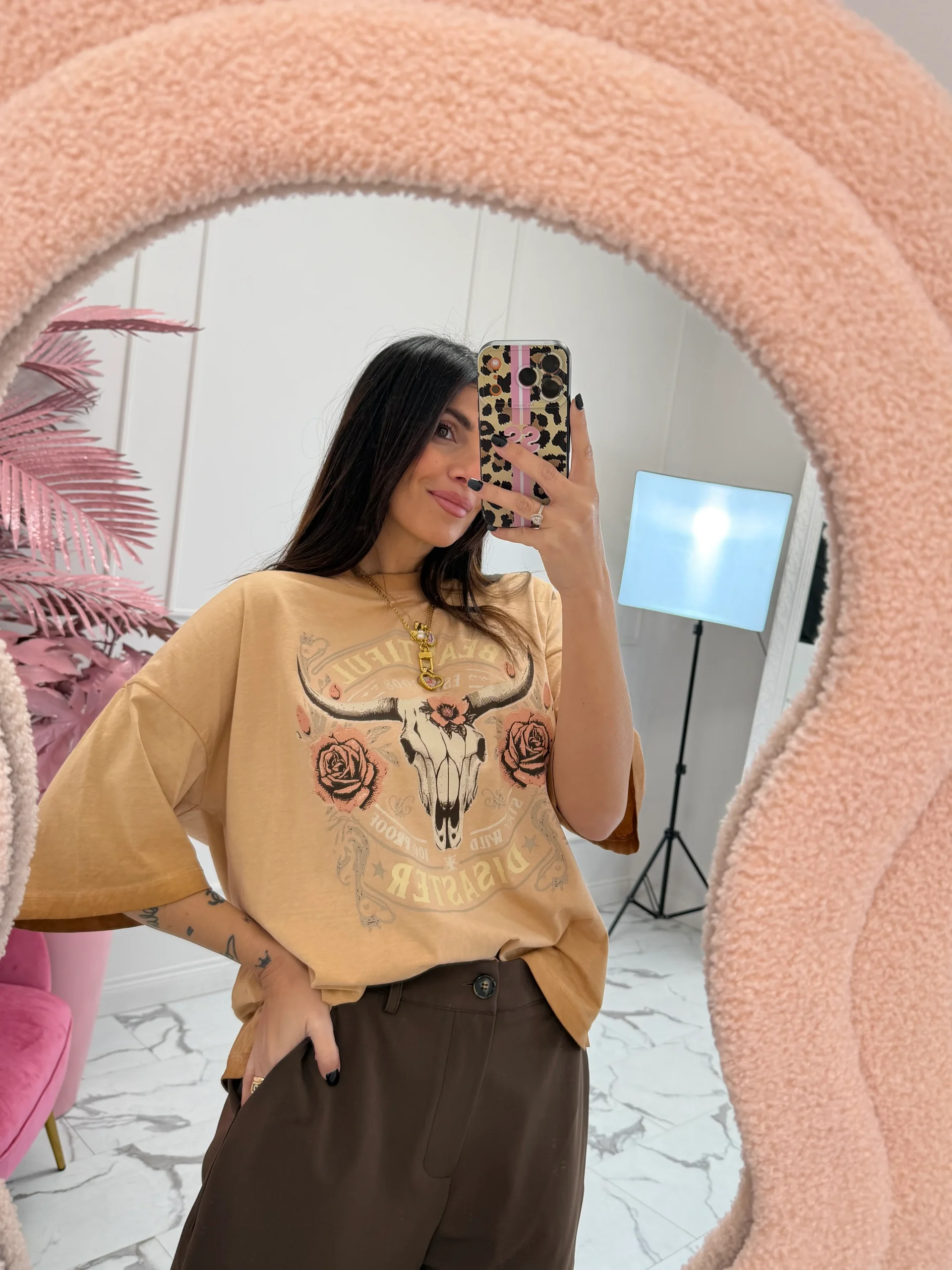 T-shirt girocollo, effetto used, con stampa tigre nella parte anteriore, vestibilità regolare. La modella è alta 160cm e la taglia è unica. composizione: 100% cotone