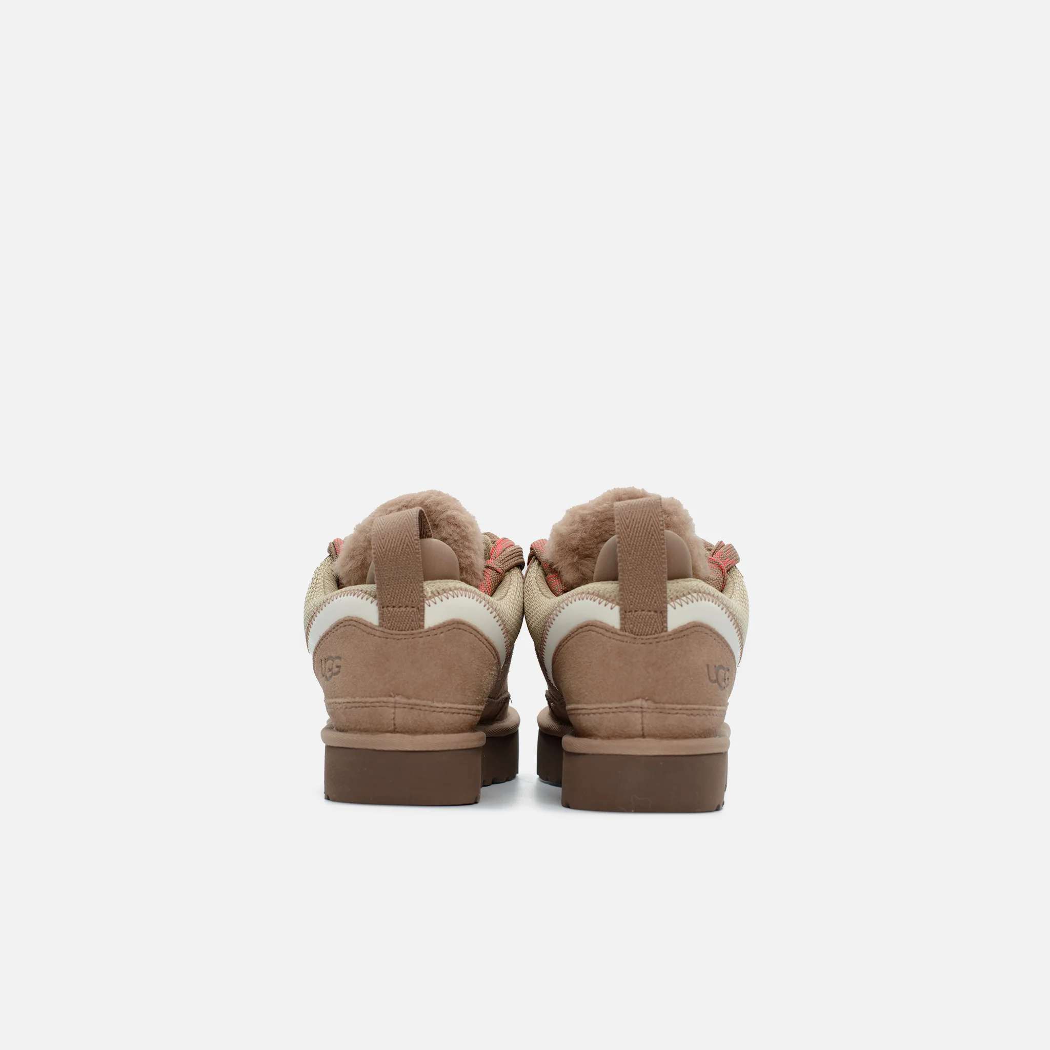 Tomaia in rete di tela intrecciata riciclata e camoscio, cinturino sul tallone in tessuto resistente, applicazione con logo UGG®, collarino imbottito, linguetta oversize imbottita