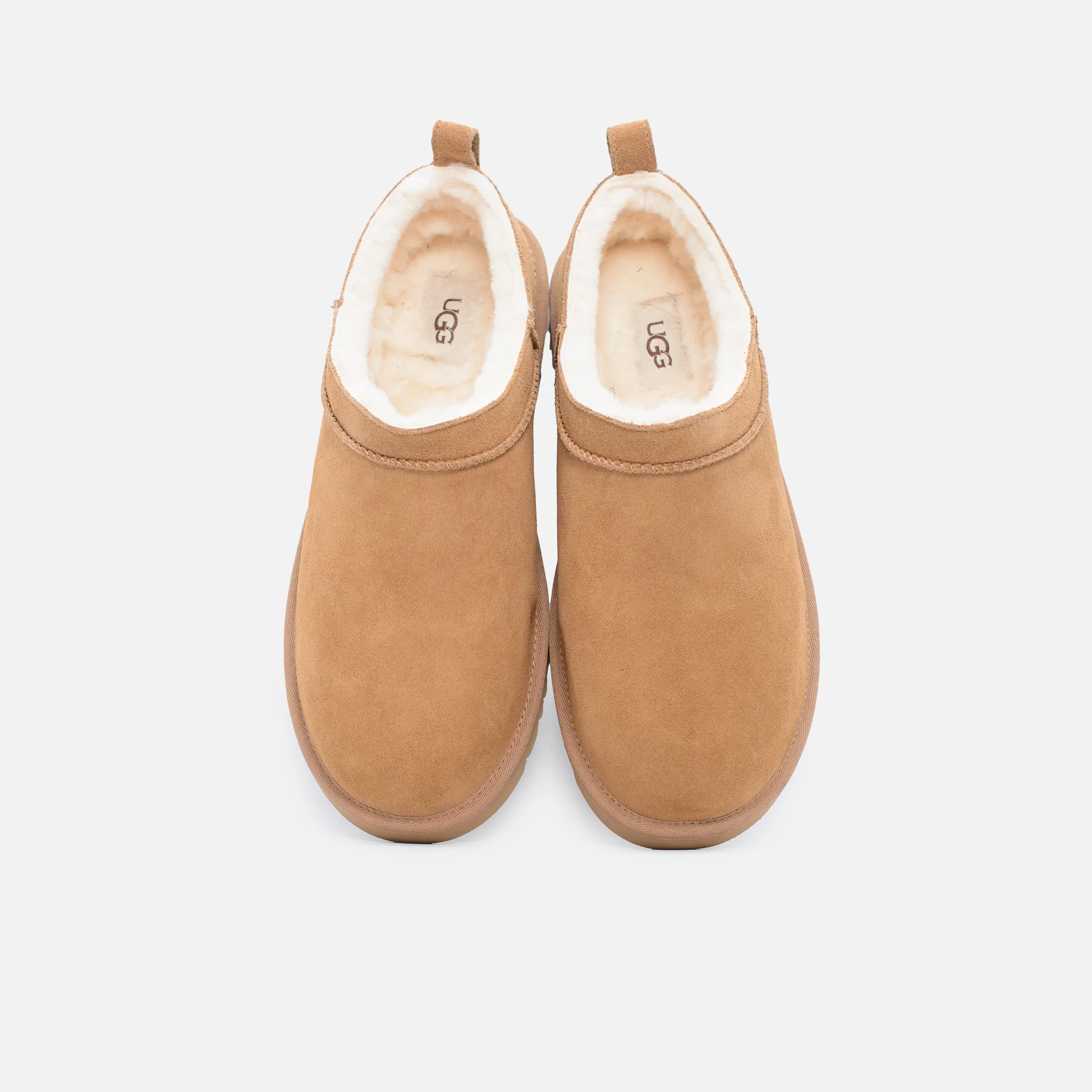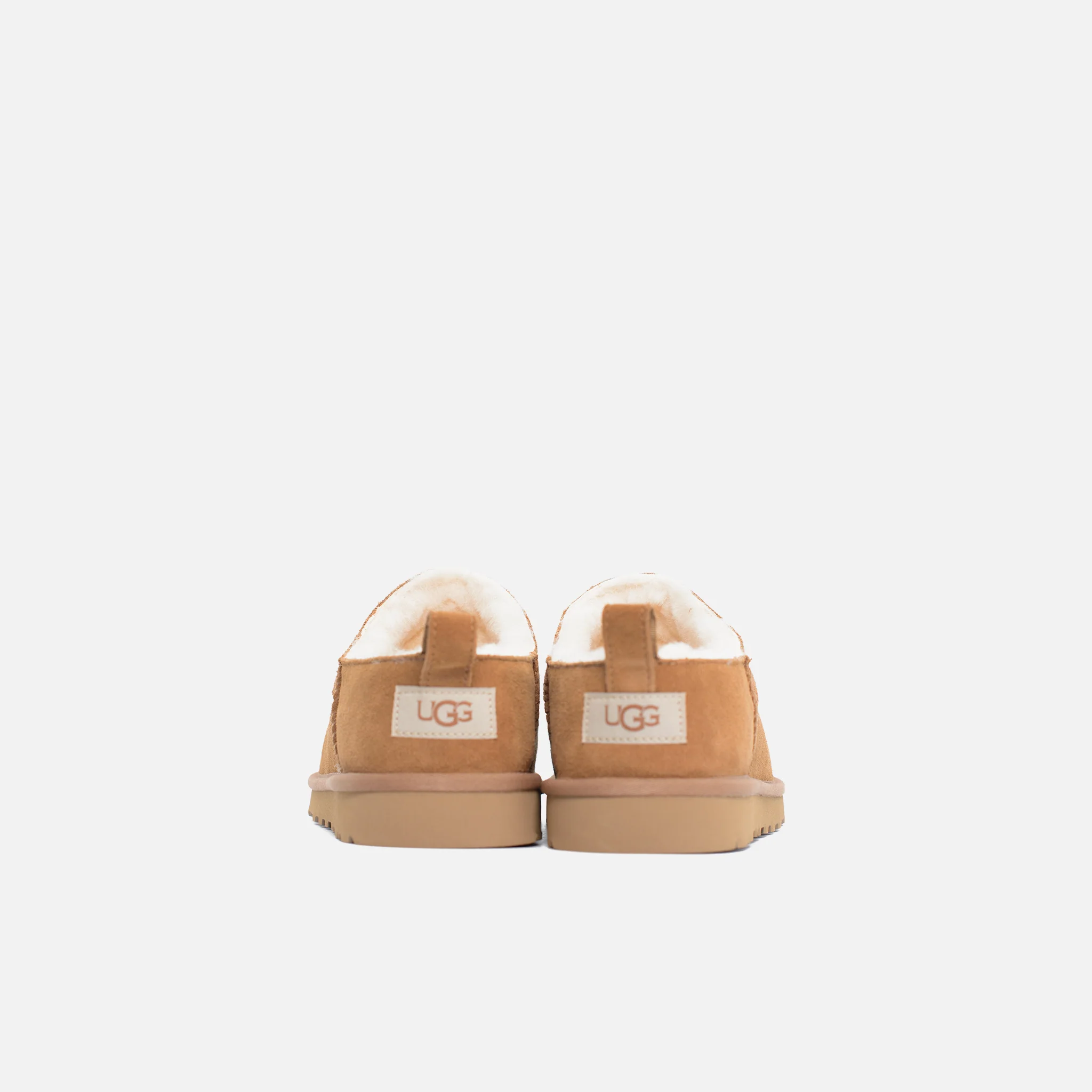Etichetta in tessuto con logo UGG® sulla soletta, etichetta in pelle con logo UGG® in rilievo sul tallone