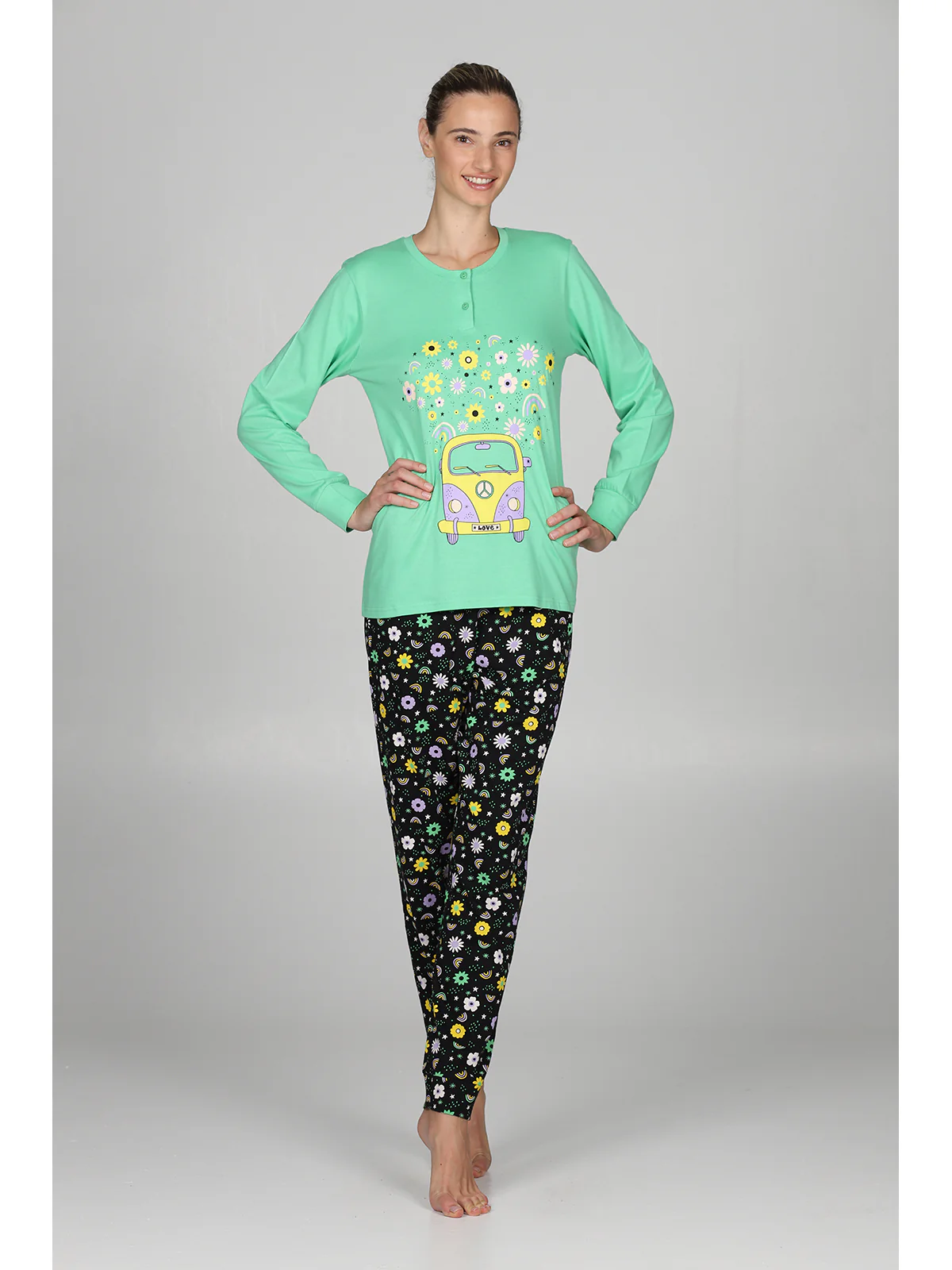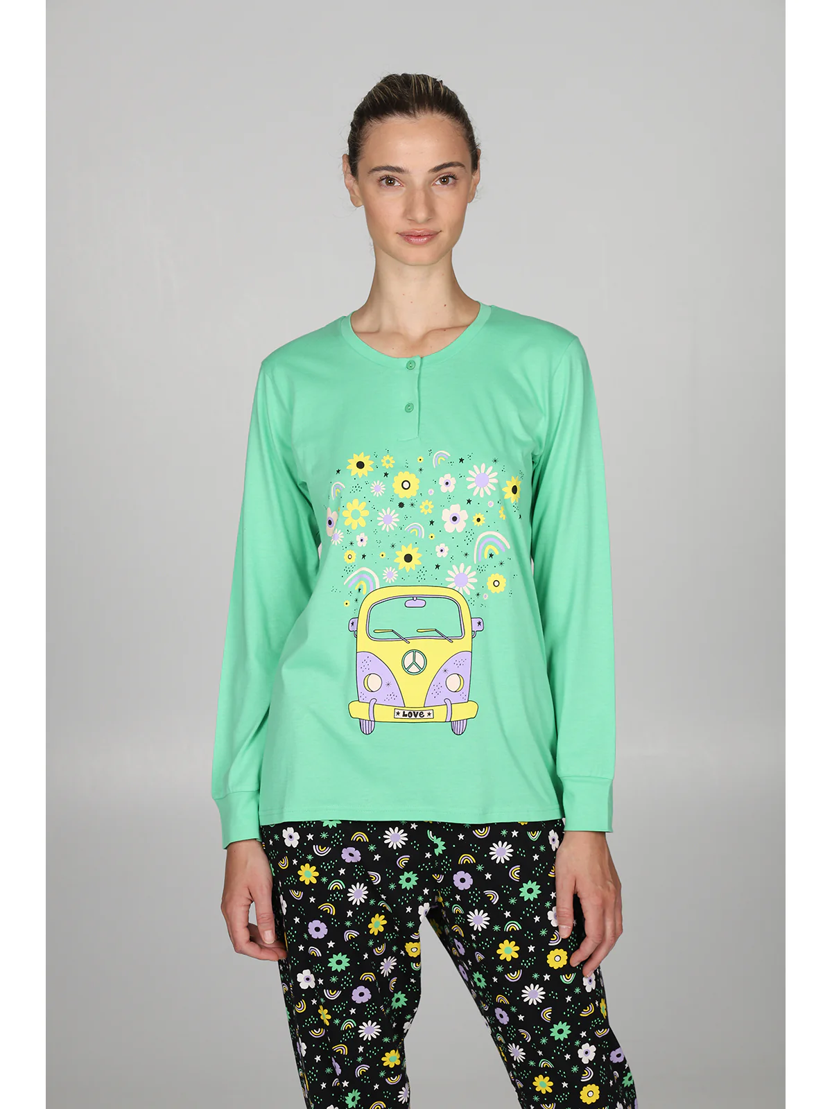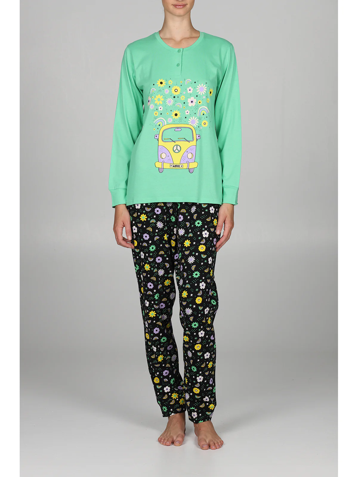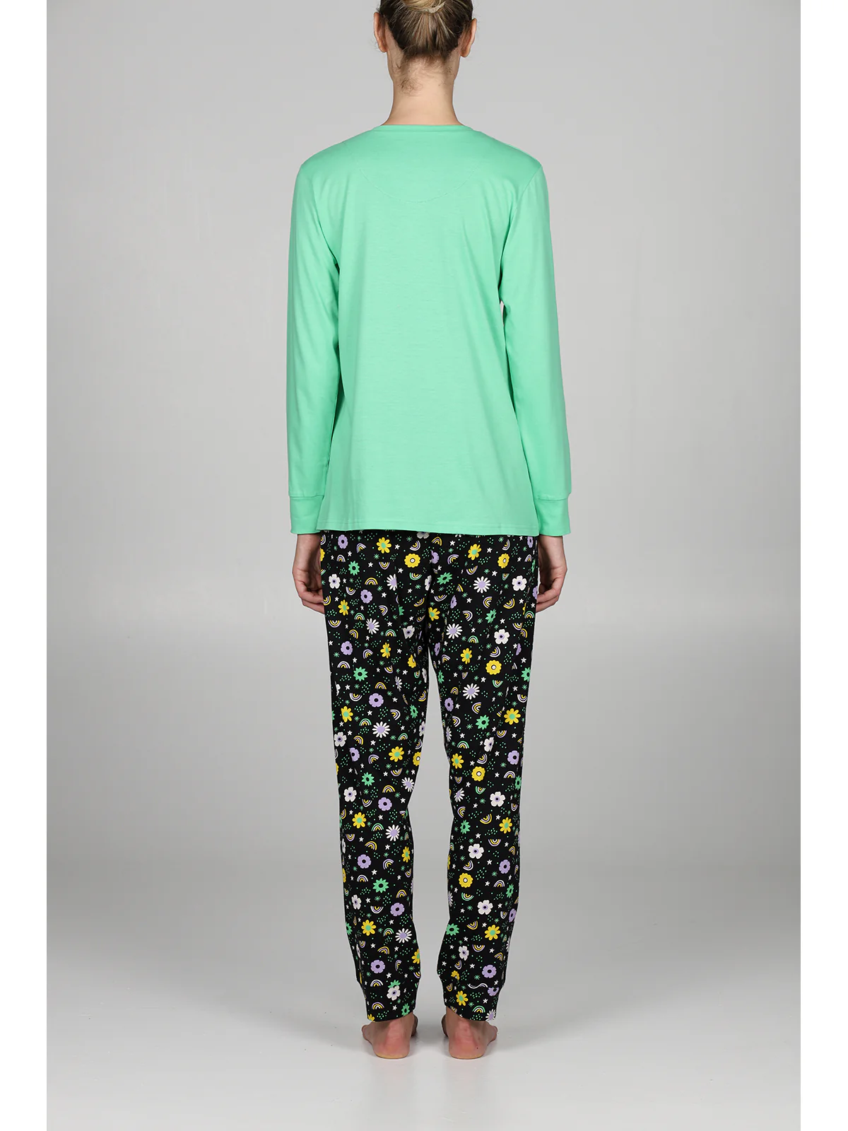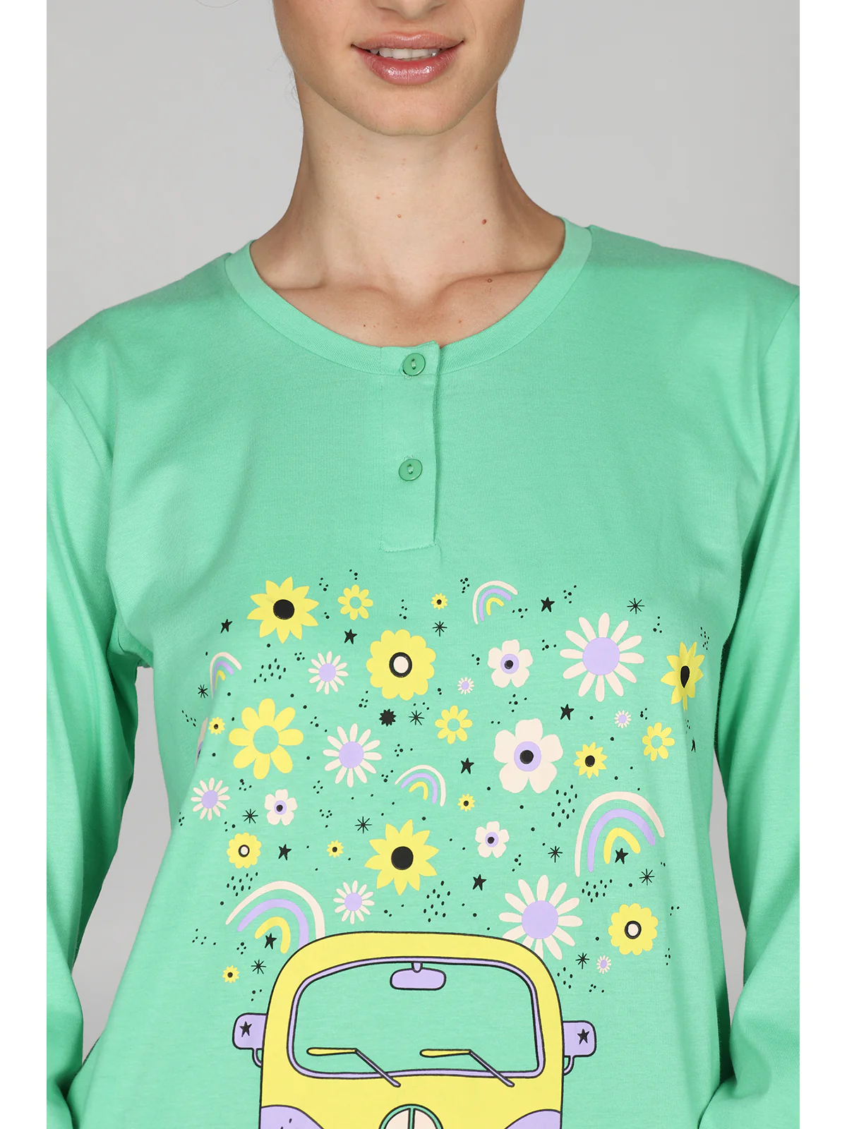 Pigiama lungo donna in fresco jersey 30/1 di puro cotone pettinato. Modello a manica lunga in vitaminica tinta unita. Pantalone lungo in fantasia con bordi. Comfort moderno per una femminilità frizzante firmata Nottebirikina.